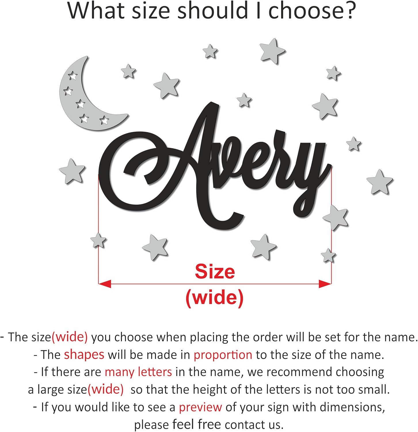 INSTANT PREVIEW. In the customization menu, you can see an instant preview of your name sign with different fonts and different sets of shapes.