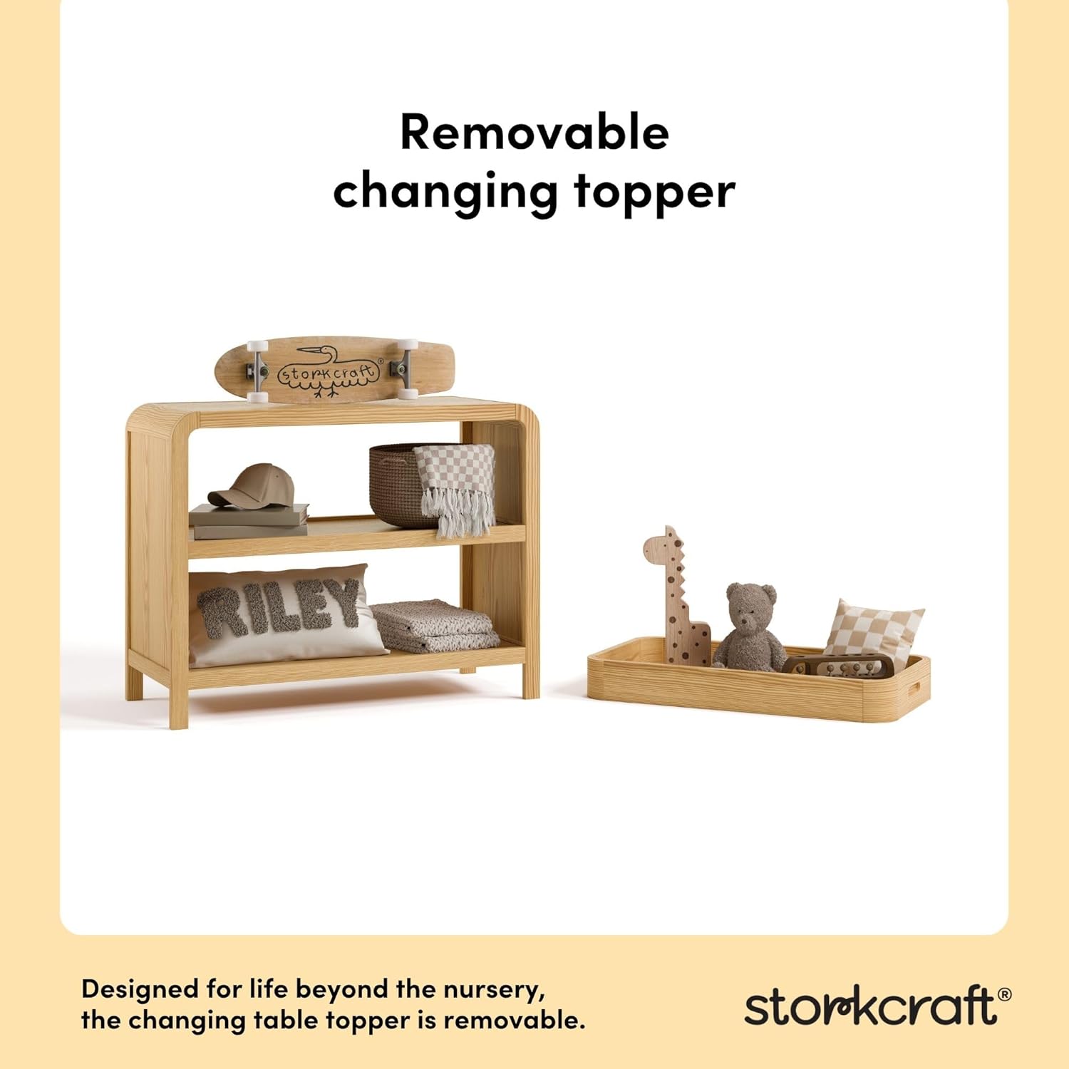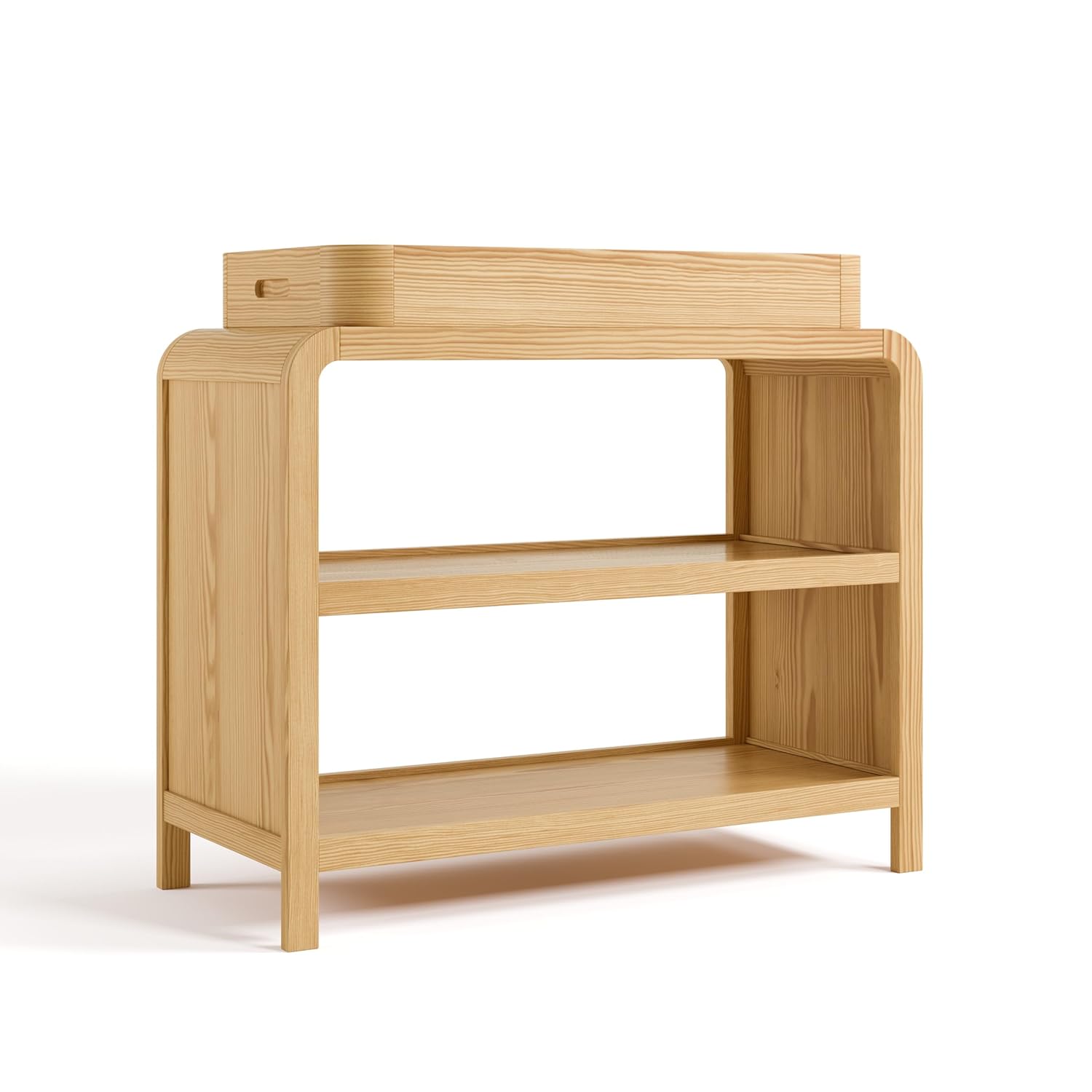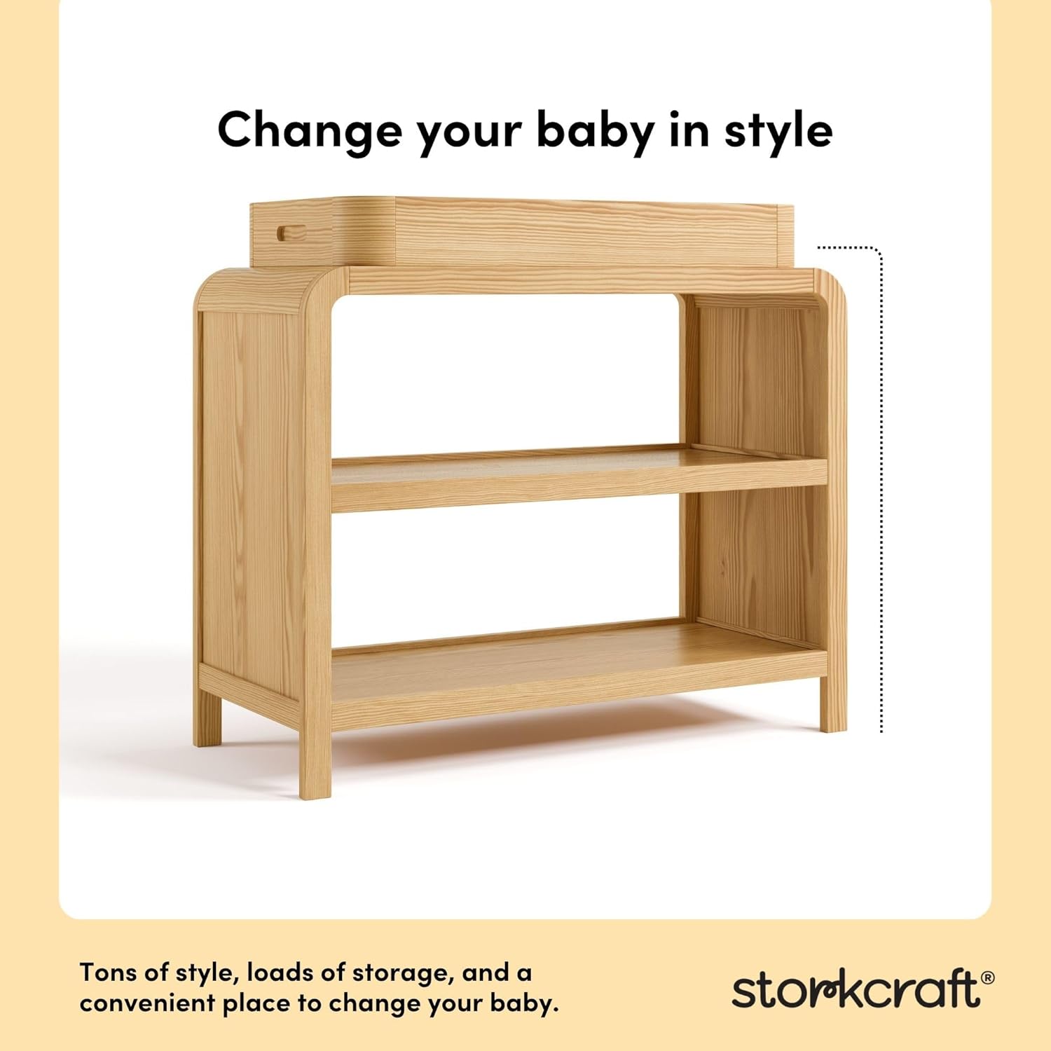 STURDY WOOD CONSTRUCTION, TIMELESS DESIGN: Clean lines, soft curves, and durable wood construction; Removable baby changing table topper fits any standard-size changing pad (changing pad not included); 2 open shelves for nursery, bedroom, & playroom storage