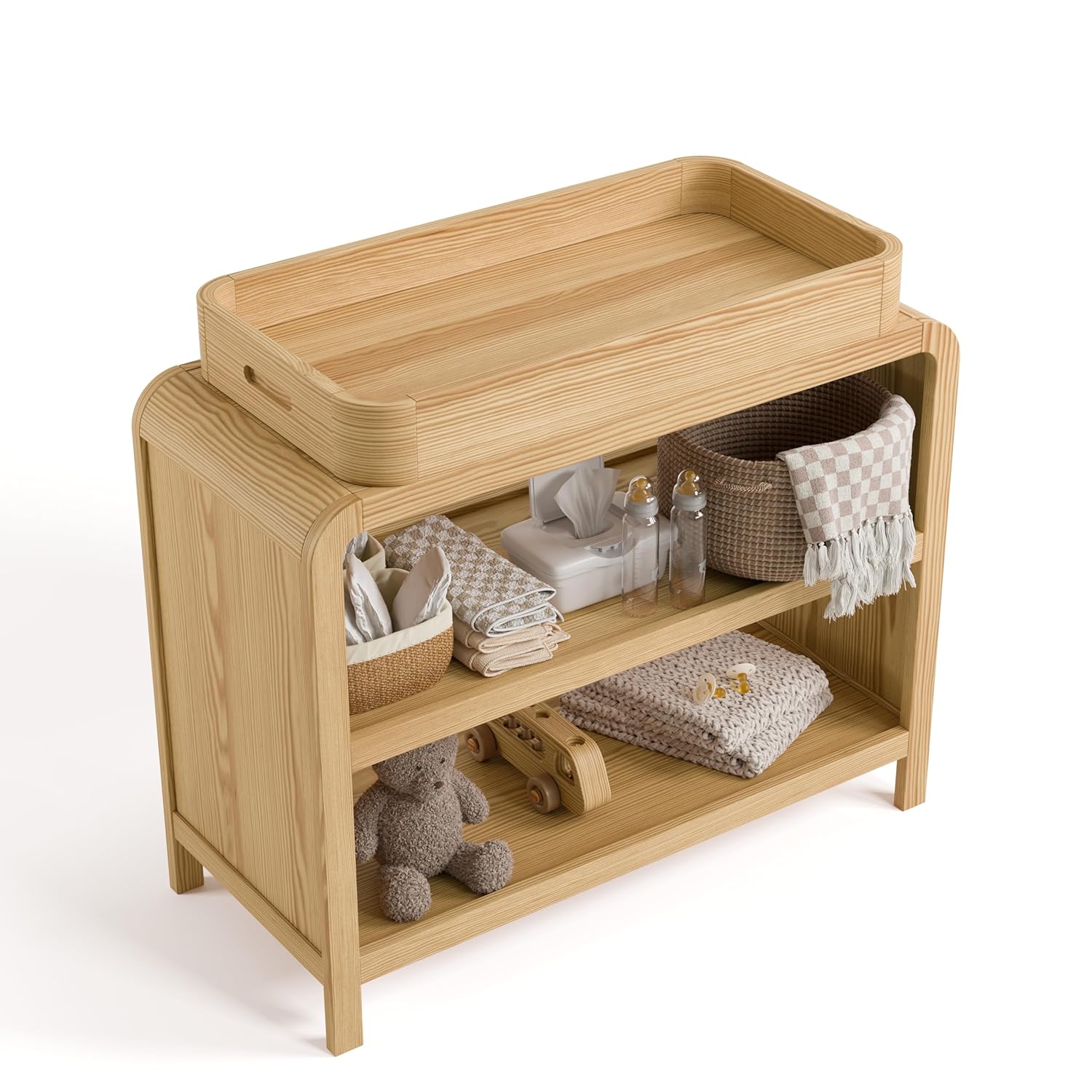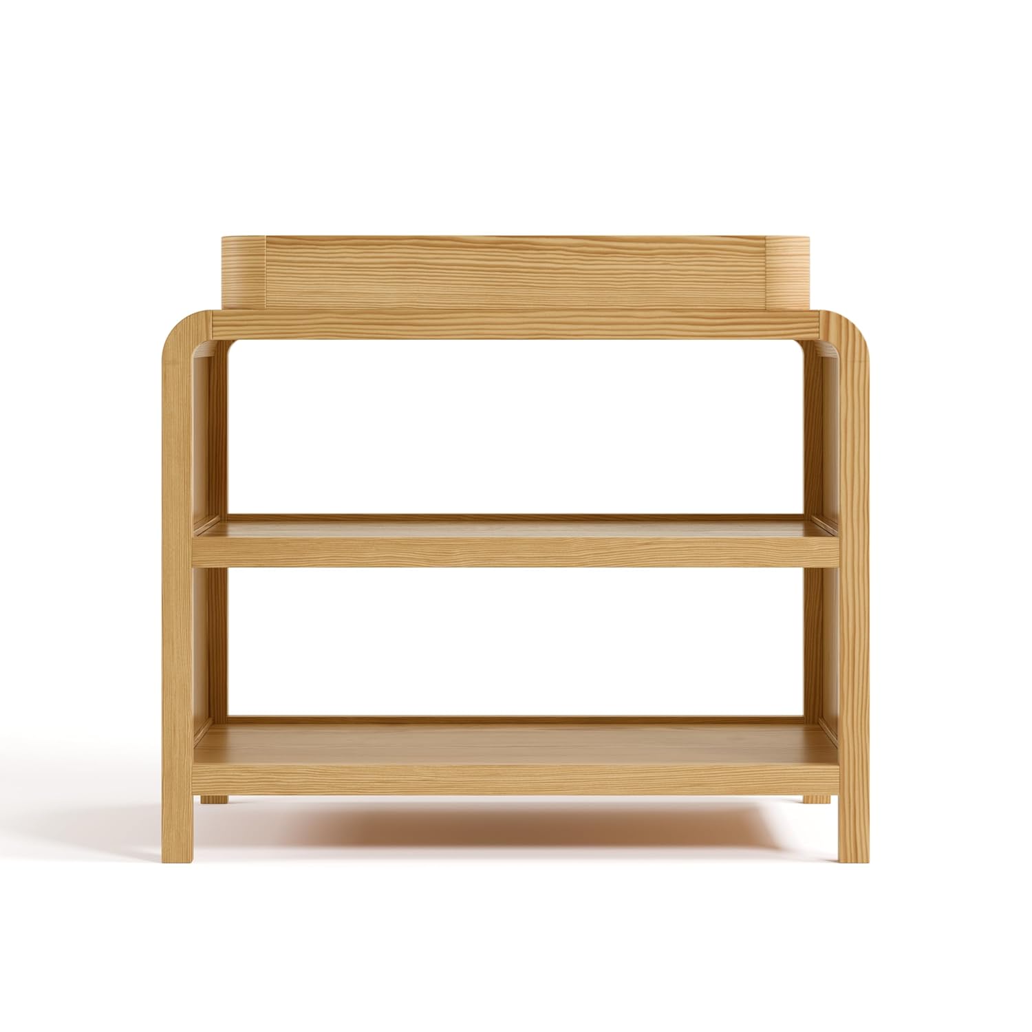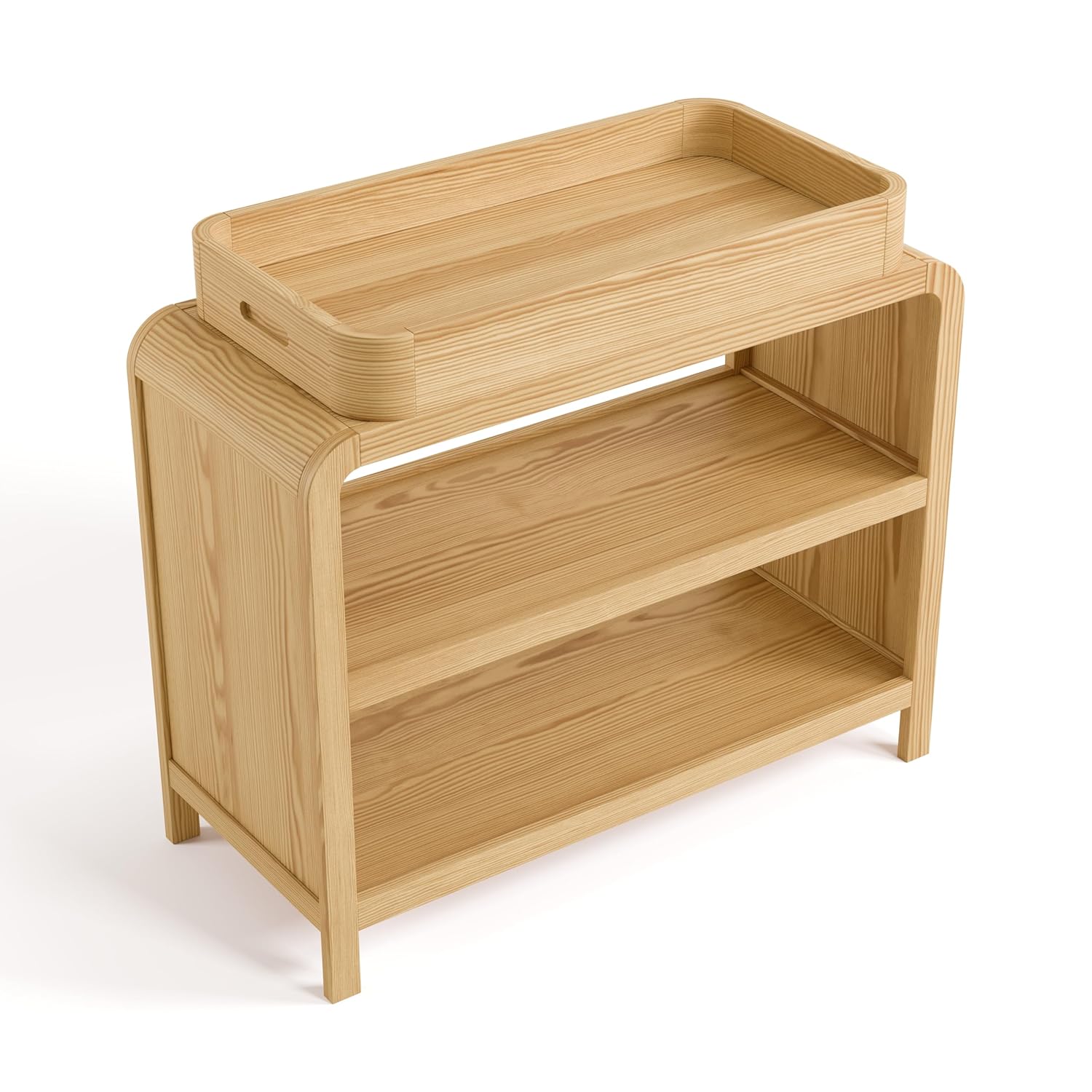 STURDY WOOD CONSTRUCTION, TIMELESS DESIGN: Clean lines, soft curves, and durable wood construction; Removable baby changing table topper fits any standard-size changing pad (changing pad not included); 2 open shelves for nursery, bedroom, & playroom storage