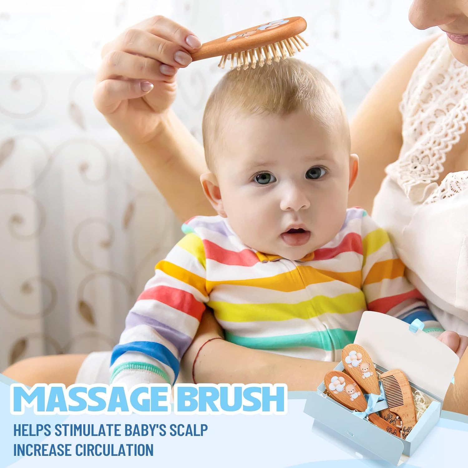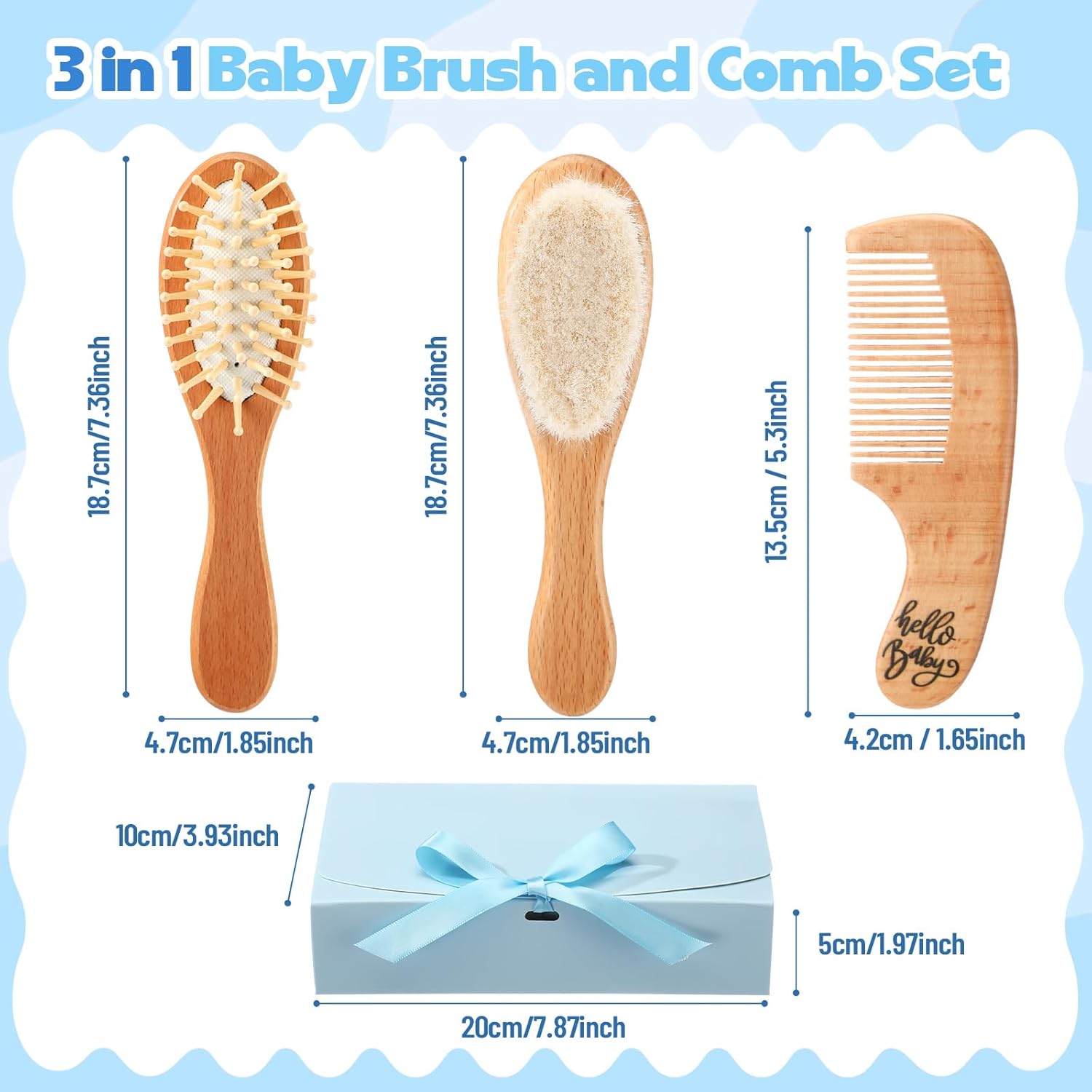Baby Shower Cute Gift: 3-in-1 complete grooming kit grows with your baby! Includes wool brush, massage brush, comb, and gift box – everything for newborn hair care in one adorable set
