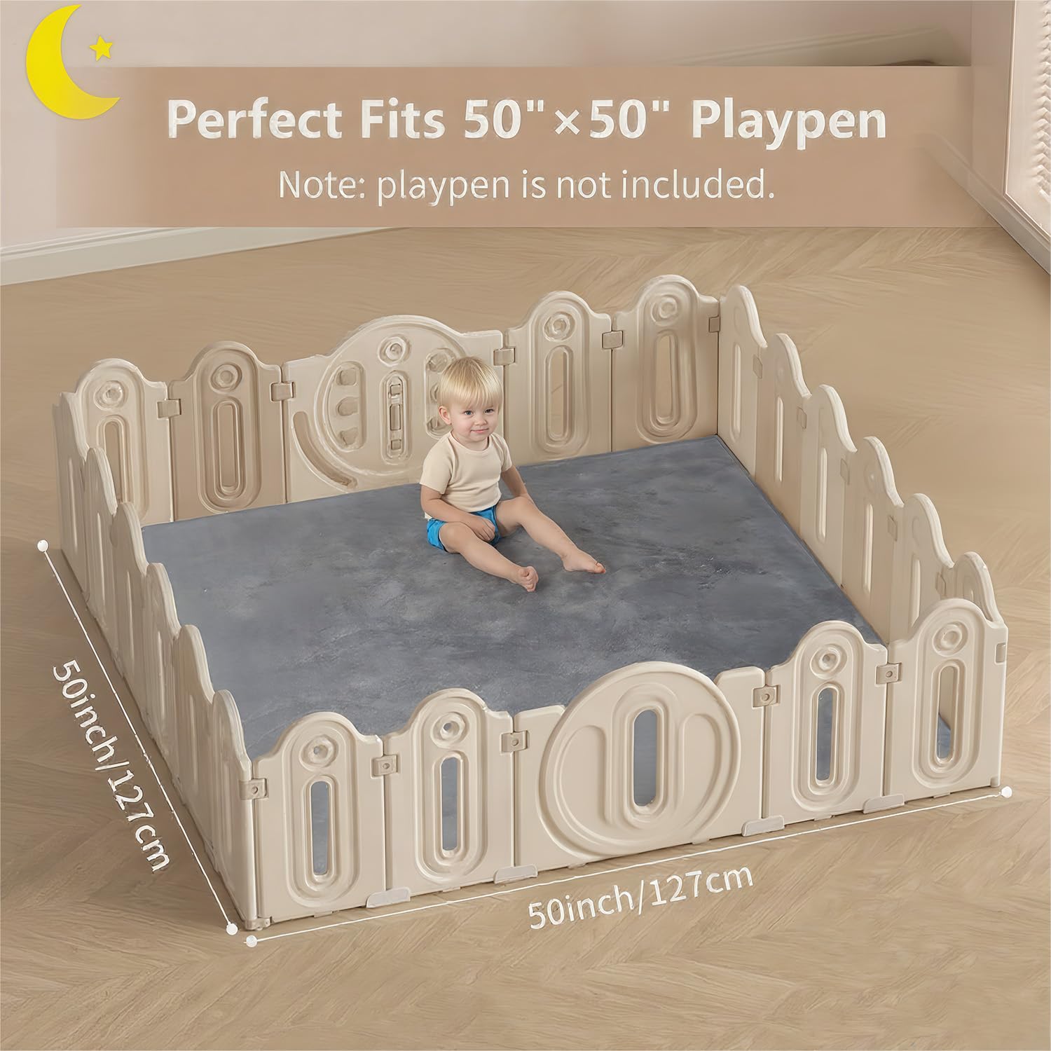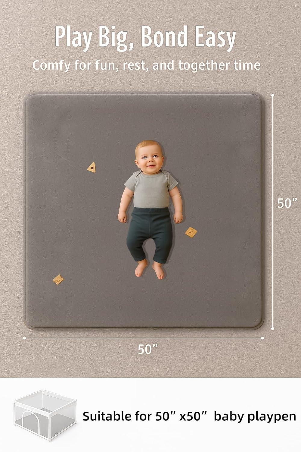 Versatile 47″ x 47″ Mat for Tummy Time & More Generously sized for playpens, nursery corners, or living rooms, this stylish and neutral-toned mat fits seamlessly into any home. Great for tummy time, baby yoga, story time, or bonding moments—at home or on the go.