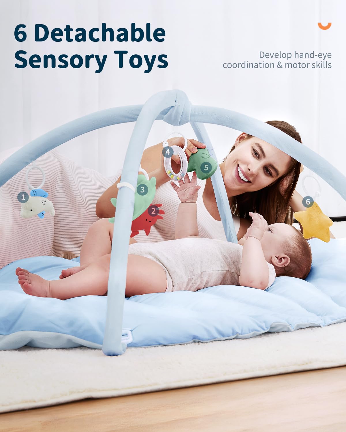 6 DETACHABLE TOYS: The baby activity gym has colorful and 6 hanging sensory toys to stimulate the baby’s vision, hearing, and touch, and foster their motor skills and hand-eye coordination.