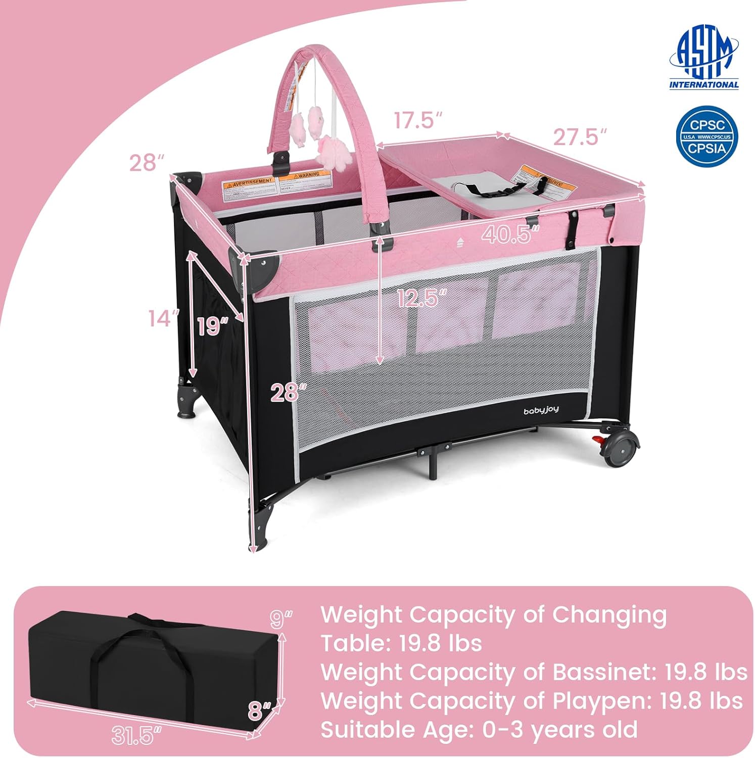 【Accompany the Baby to Grow up】 BABY JOY 3 in 1 foldable pink pack and play designed to transit from newborn to toddler, accompanies the growth of your baby. Water-resistant changing table holds a baby stably. Removable newborn bassinet for baby to take a nap. The full-sized toddler playard could provide the wide space allows the baby to practice standing and walking, available from baby to toddles.