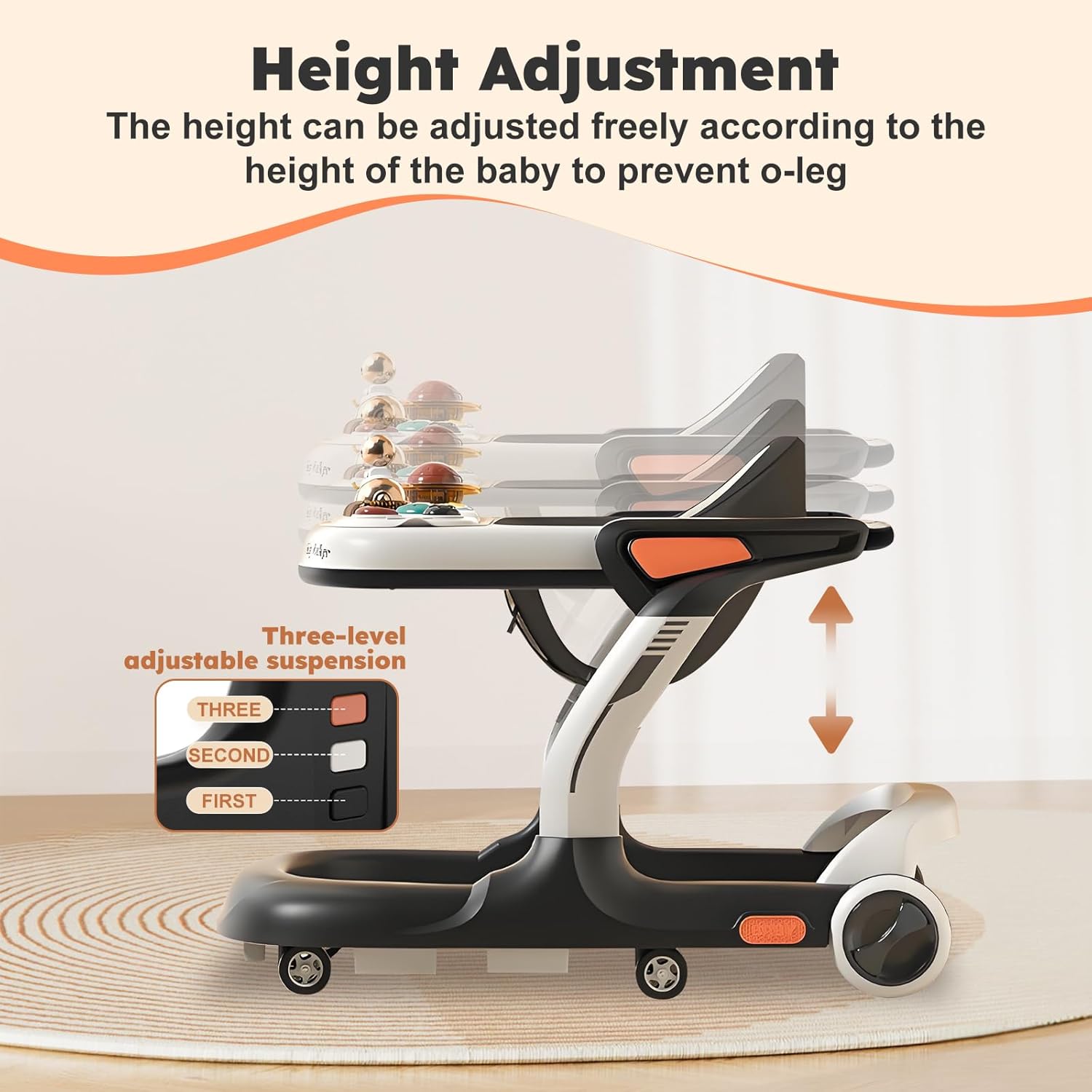 360-degree universal wheel ensures that the baby can move flexibly in all directionsAt the same time, the widened base is larger than the table top extension diameter, so even if it colides with the wall or cabinet,it will not causeiniures to the babv’s hands or head