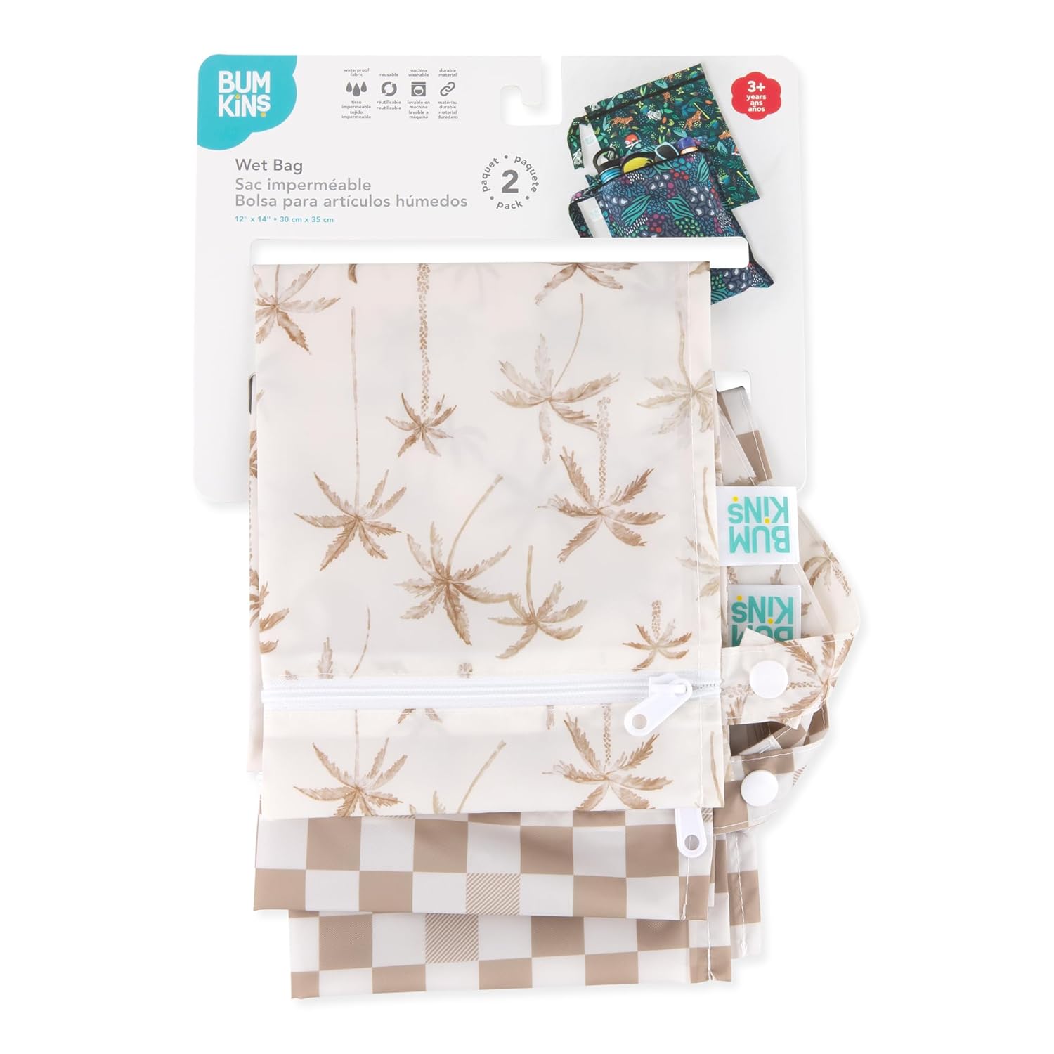 Bumkins Waterproof Wet Bag for Baby, Travel, Swim Suit, Cloth Diapers, Pump Parts, Pool, Beach, Gym Clothes, Toiletry, Hook to Stroller, Daycare, Zip Reusable Wetdry Pack, 2-pk Palm Trees, Beige Check