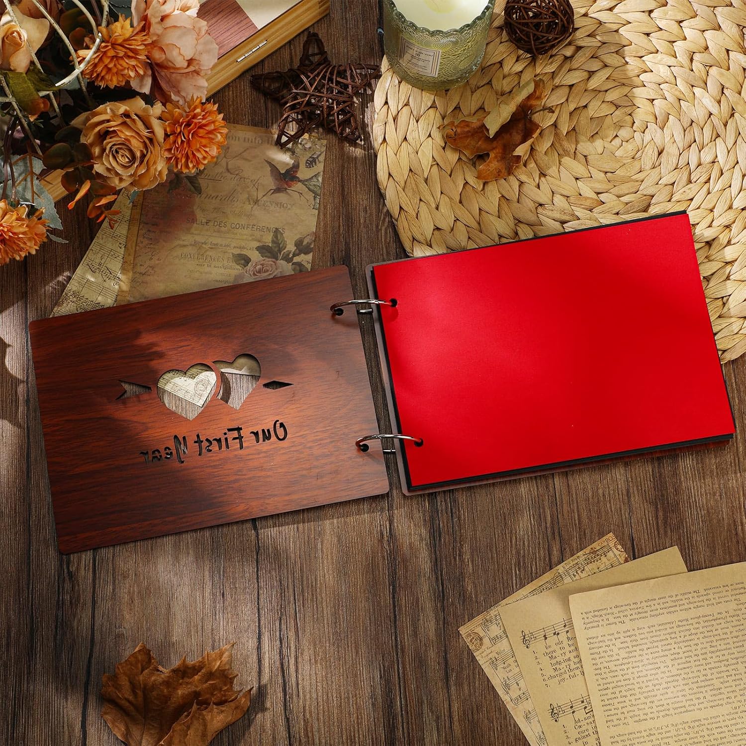 Features: Your life and the time you spend with your partner are stories that should be preserved for future generations to read and reminisce about. Making a scrapbook or photo album for your one year anniversary is a nice idea. This quality anniversary album with heart shaped has 30 sheets (60 pages). Celebrate your first anniversary in style, with a dedicated area to memorialize every unforgettable experience. Specifications: Material: wood, cardboard Color: Cover: Walnut Inner cardboard: Black Size: photo album is about 8.39 x 5.9 inches/ 21.3 x 15 cm Package includes: 1 x One year anniversary photo album Notes: Manual measurement, please allow slight errors on size. The color may exist a slight difference due to different screen displays.