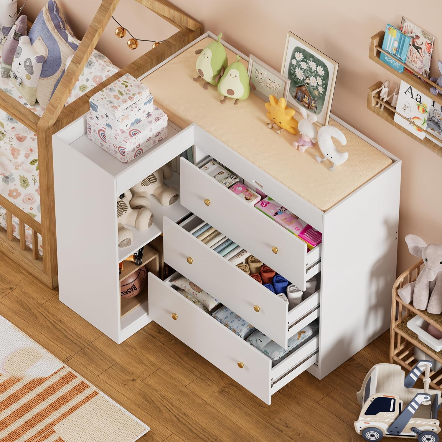 【Simple and Comfortable】baby diaper changing station features a simple design,And adopting ergonomic design reduces the need for parents to bend over,And it helps alleviate fatigue in the back and waist,nursery dresser can perfectly match different home styles and color tones,Add extra storage space to your bedroom, living room, baby room, or apartment.