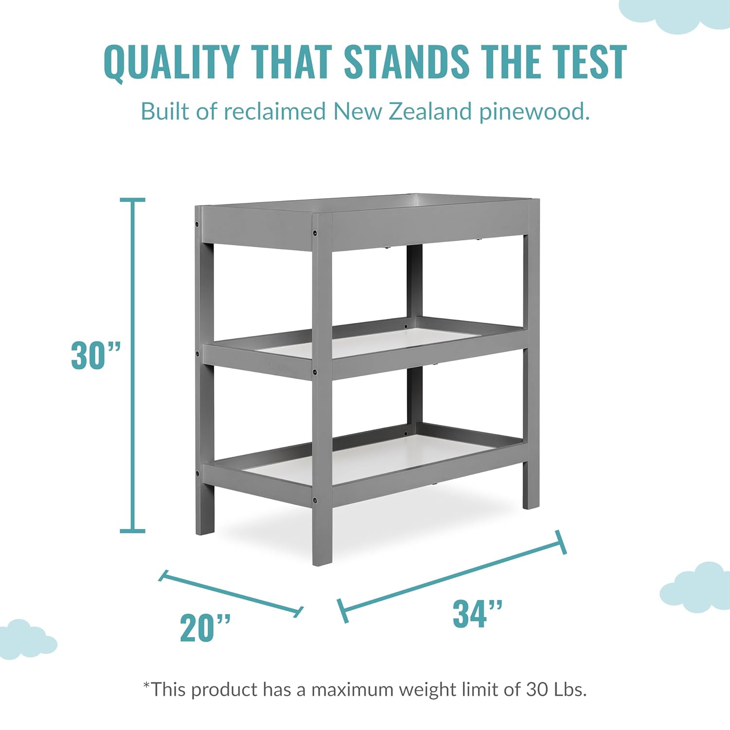 A changing table is a must-have in a nursery and the Ridgefield Changing Table is a functional and stylish solution that works beautifully with a variety of color palettes and nursery themes. Use it as a changing station when your child is young, and as your child grows older, as a night stand! The mattress changing platform is made of metal and features a water resistant mattress pad for changing that has a safety strap for keeping baby secure.Safety rails surround the changing station on four sides making the table a fully enclosed and secure space. The Ridgefield is tested for lead and other toxic elements and meets applicable ASTM standards.The Ridgefield comes with two easy-to-reach, spacious shelves below the changing table that allow you to keep your LOs essentials neatly organized and easy to access! Made of New Zealand pinewood, it features a clean design and is available in four vibrant finishes. Mix and match with Dream On Me Cribs as you design a beautiful and fun nursery space for your child.Product dimensions are 33.5Lx16Wx33.5H inches and maximum weight limit is 30 lbs. Comes with anti-tipping tool kit.
