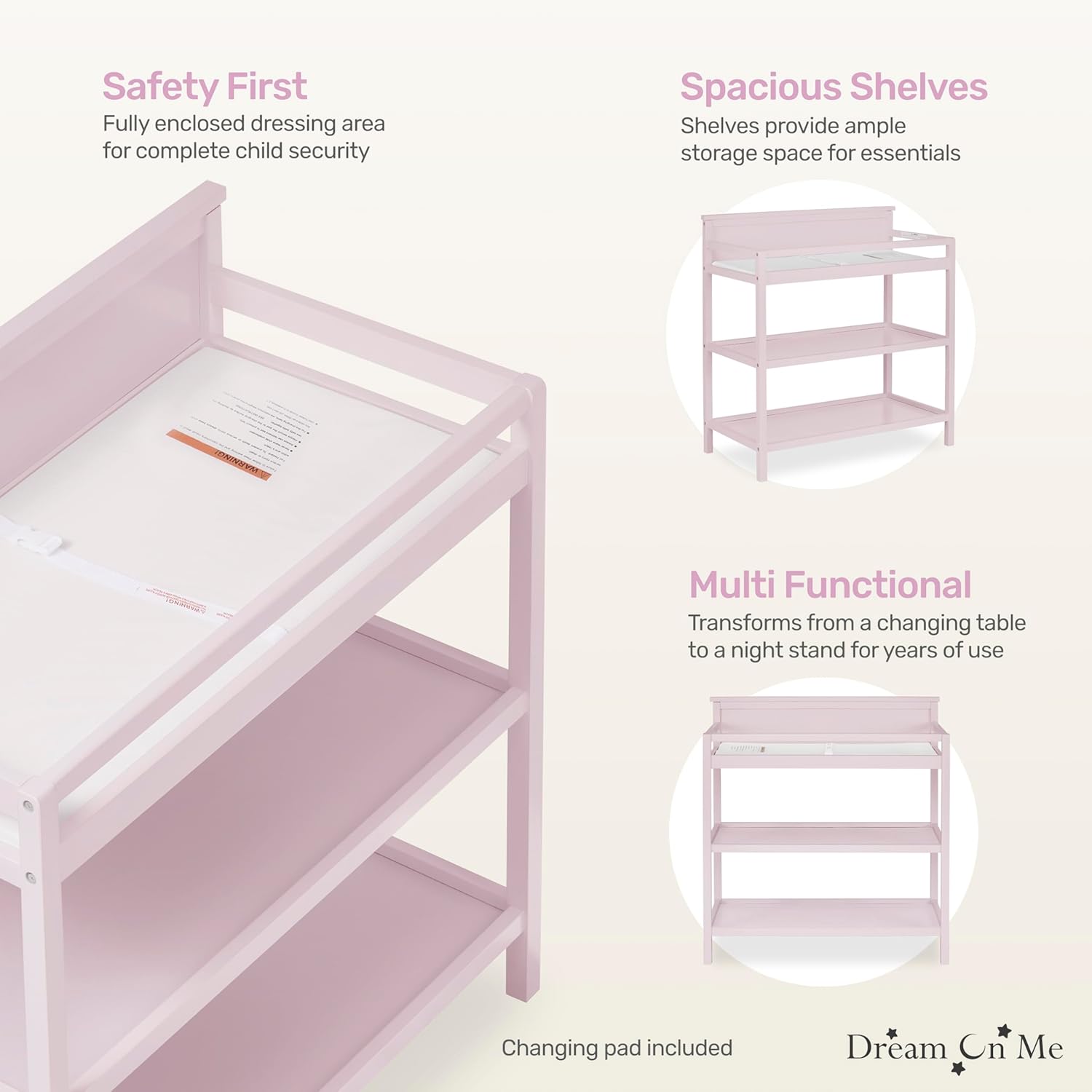 Dream On Me Jax Universal Changing Table is perfect for any nursery. This changing table has a clean modern line design, with a water resistant mattress pad for changing including a safety strap with a fully enclosed dressing area for extra security. Dream On Me Jax changing table has 2 fixed shelves for open storage which is ideal for diapers, wipes and other essentials. This changing table can transition into a night stand as your baby gets older. Dream On Me Jax changing table coordinates with All Dream On Me Crib. All Dream On Me products meets or exceeds government and ASTM safety Standard.
