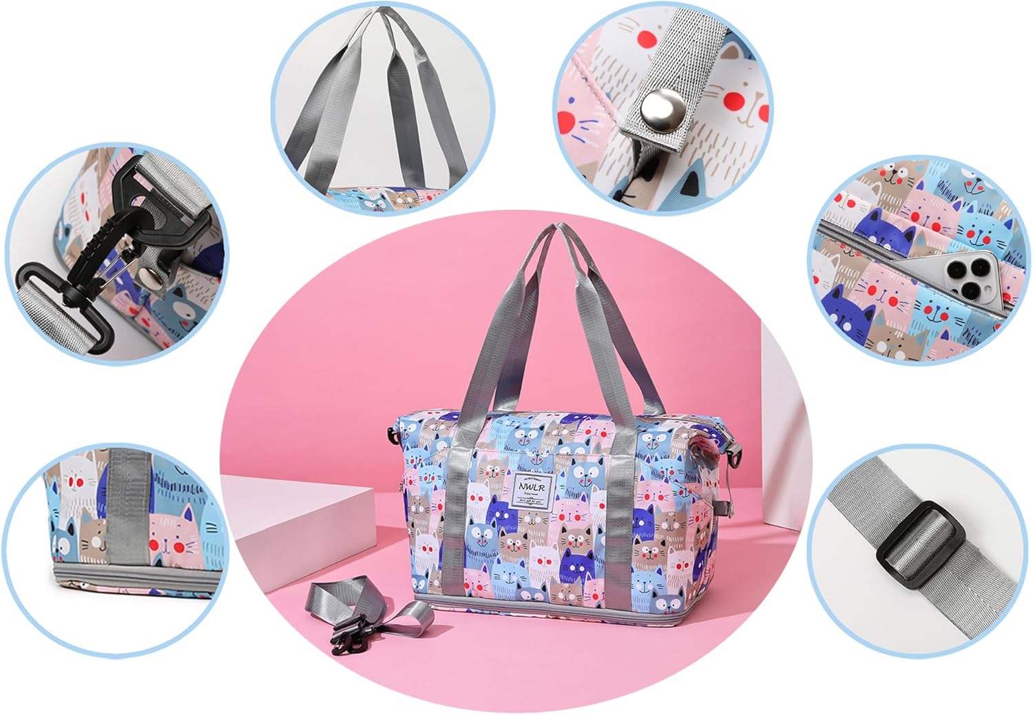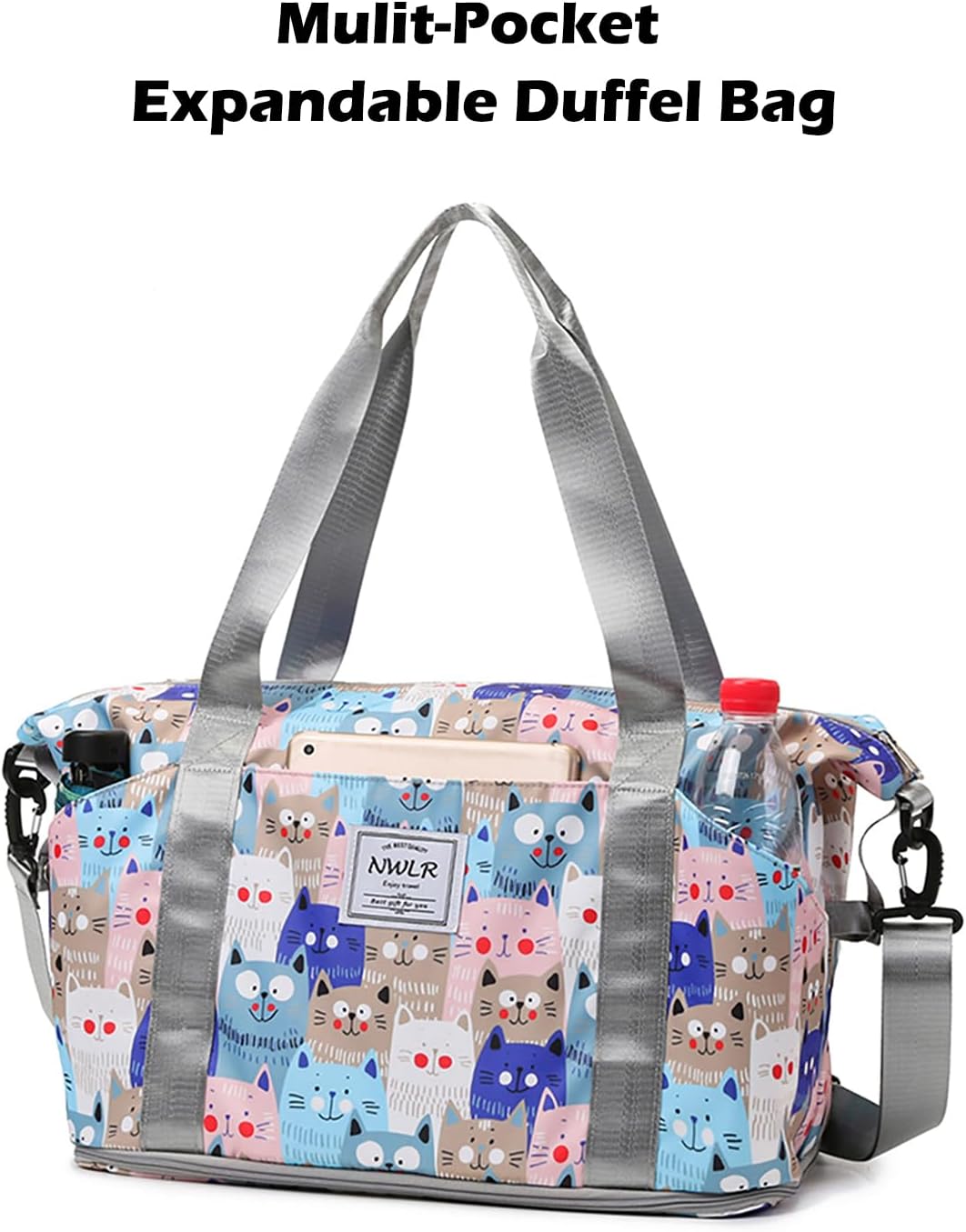 Customers find the duffel bag spacious enough to pack 4 outfits, with one mentioning it holds 2-3 days’ worth of travel items. The bag features a cat pattern that customers love, holds up well on flights, and is perfect for weekend trips. Customers appreciate its expandable design and color, though some report issues with the zipper breaking after first use.