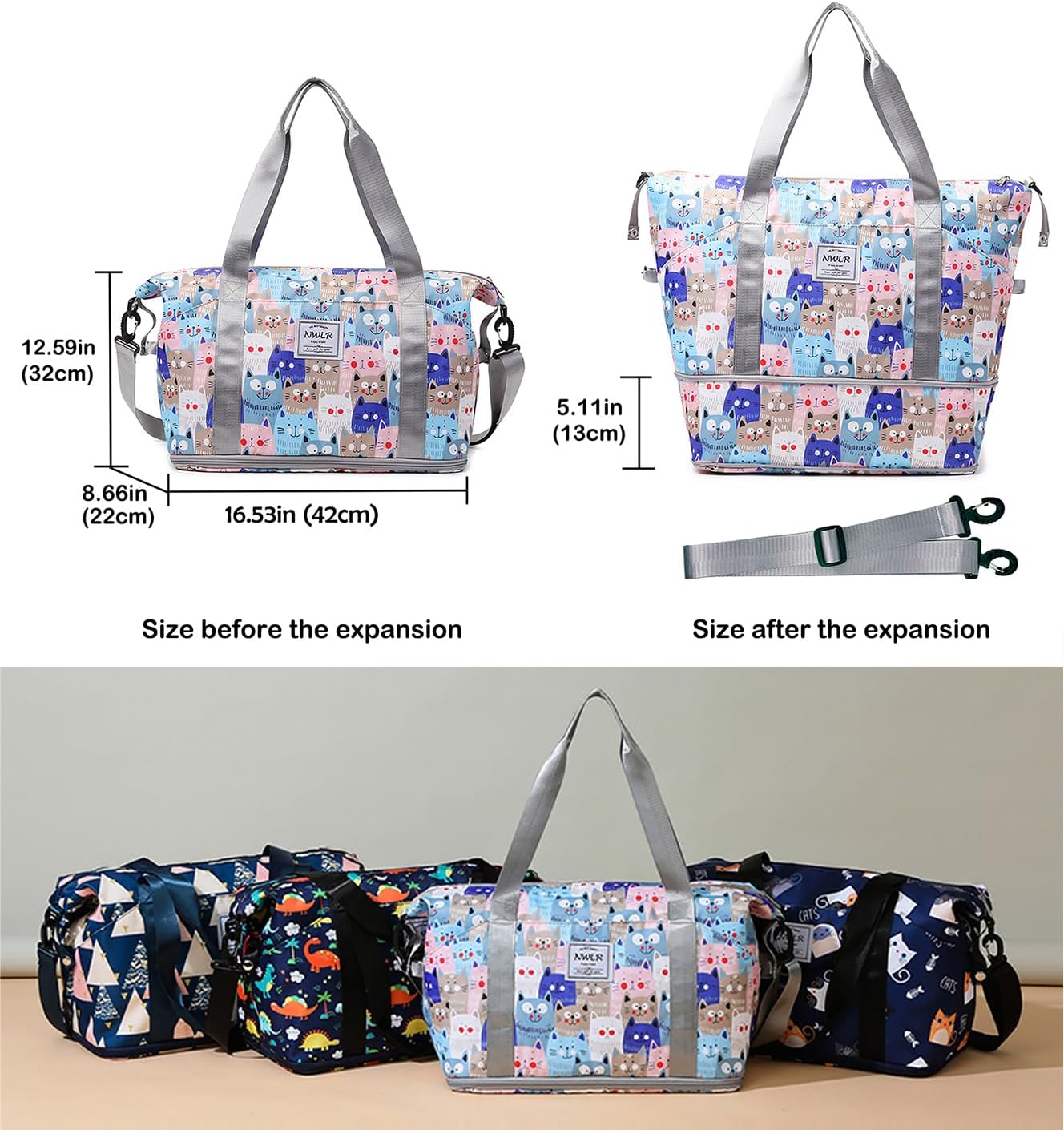 Multi-Pocket Expandable Travel Duffle Bag: The bottom of the bag has an extended zipper layer design. Expansion before size:(L*W*H) 16.53in*8.66in*12.59in(42cm*22cm*32cm), Expansion after size:(L*W*H) 16.53in*8.66in*17.71in(42cm*22cm*45cm) weight: only 1.1lb (0.5kg) .Multiple Pockets & Large Capacity: front pocket *3, a big main pocket, 2 inner pockets, a dry and wet separation pocket, The back of the bag has a zipper pocket. Dry and Wet Separated: The high density waterproof material can help you separate dry and wet items.