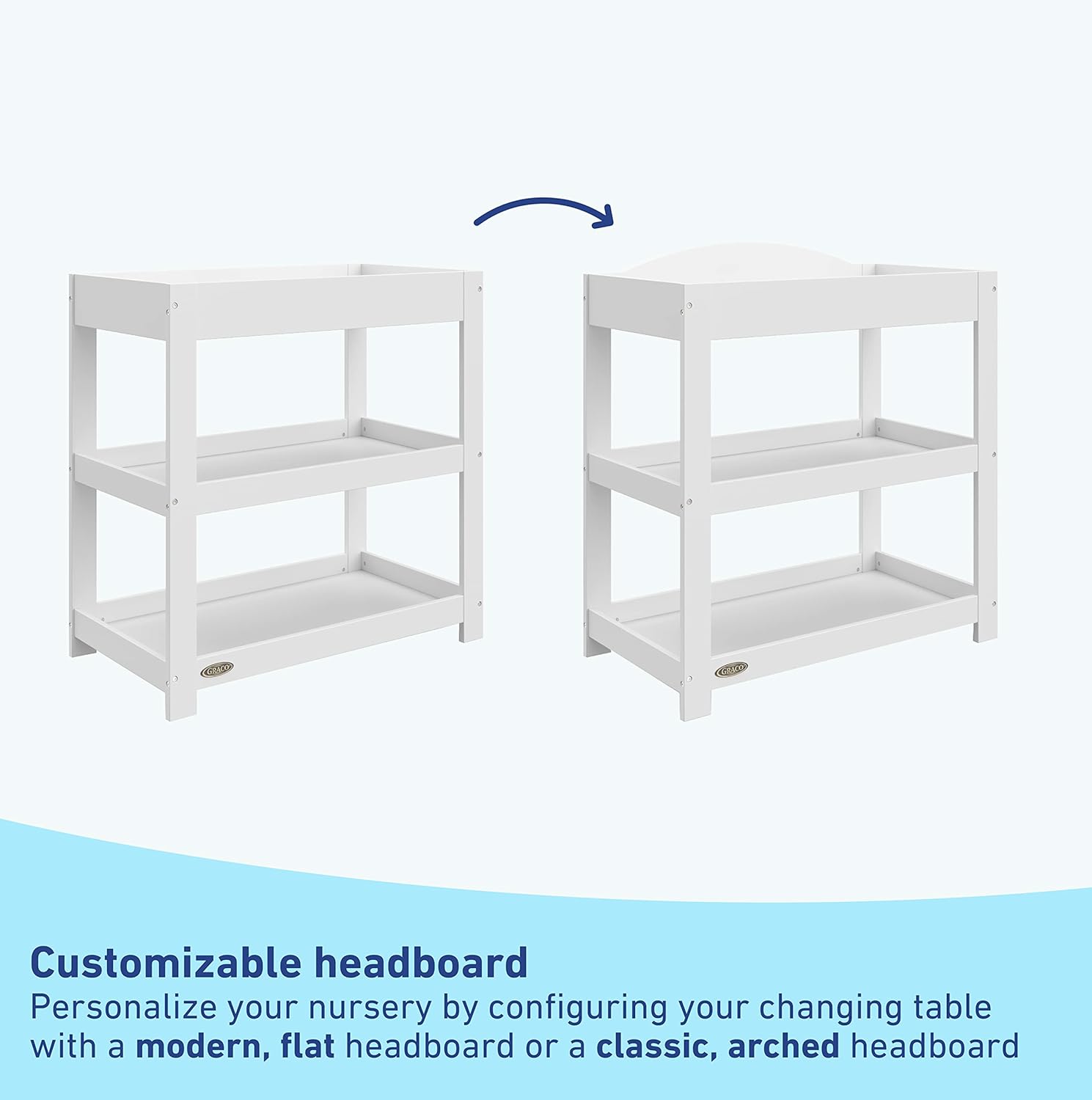 Customize your nursery by choosing between a classic or modern design — introducing the Graco Customizable Changing Table with Bonus Water-Resistant Changing Pad. While the Graco Customizable Changing Table is designed to match perfectly with any Graco crib, its easy-to-match design makes the Graco Customizable Changing Table easy to pair with any brand or style of crib. With its ability to be assembled with either a modern, flat headboard or classic, arched headboard, the Graco Customizable Changing Table with Bonus Water-Resistant Changing Pad features 2 open storage shelves to store your nursery and changing essentials. Also, the changing table includes a bonus water-resistant baby changing pad with safety strap. The Graco Customizable Changing Table is crafted from wood composites, laminated with a durable, easy-to-clean melamine coated surface, and its applied finish has been tested to meet or exceed the applicable ASTM and CPSIA safety standards. Also, like all Graco changing tables, the Graco Customizable Changing Table is JPMA Certified — meaning it’s been expert tested to meet or exceed all applicable category voluntary and mandatory safety standards. Graco is the proud recipient of the Parent Tested Parent Approved (PTPA) Seal of Approval for nursery and children’s bedroom furniture, and the 2022 Women’s Choice Award for 9 out of 10 Recommended Baby & Kids Furniture. Backed by a 1-year limited manufacturer’s warranty. Assembly required.