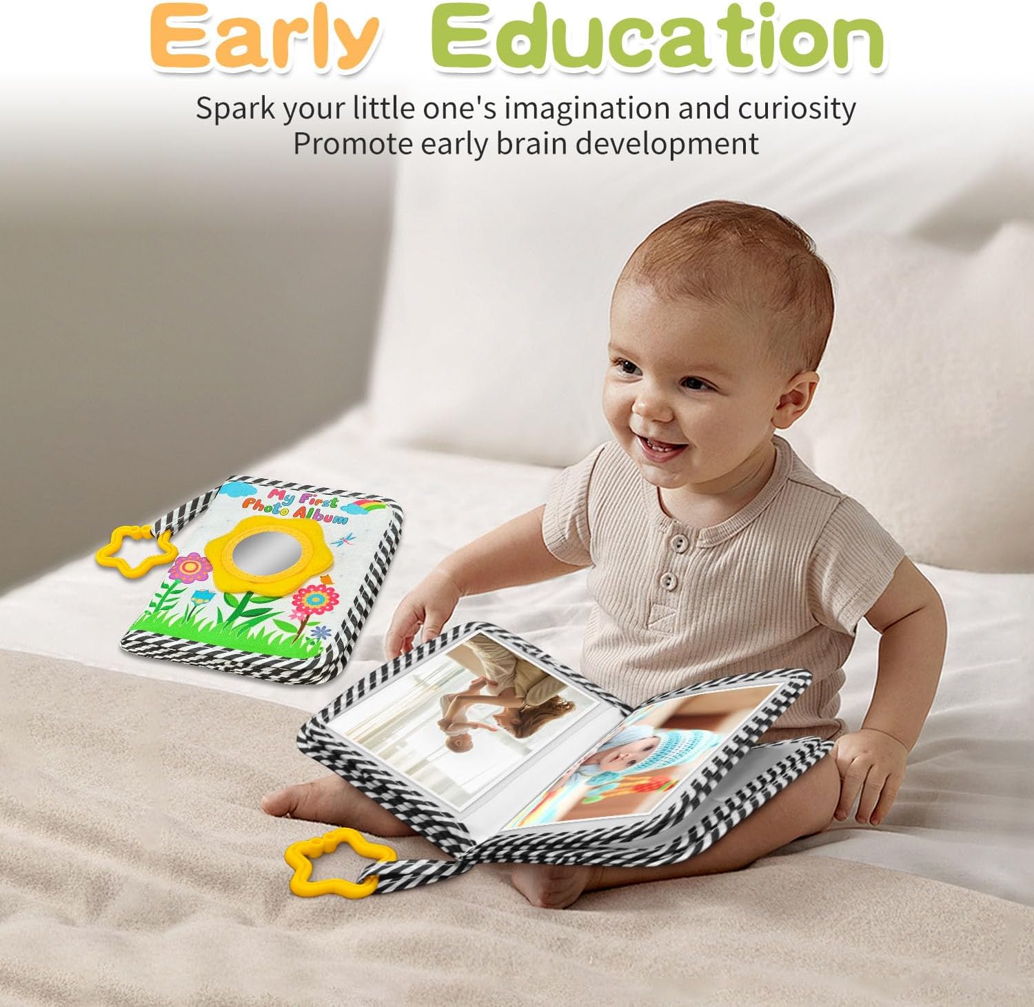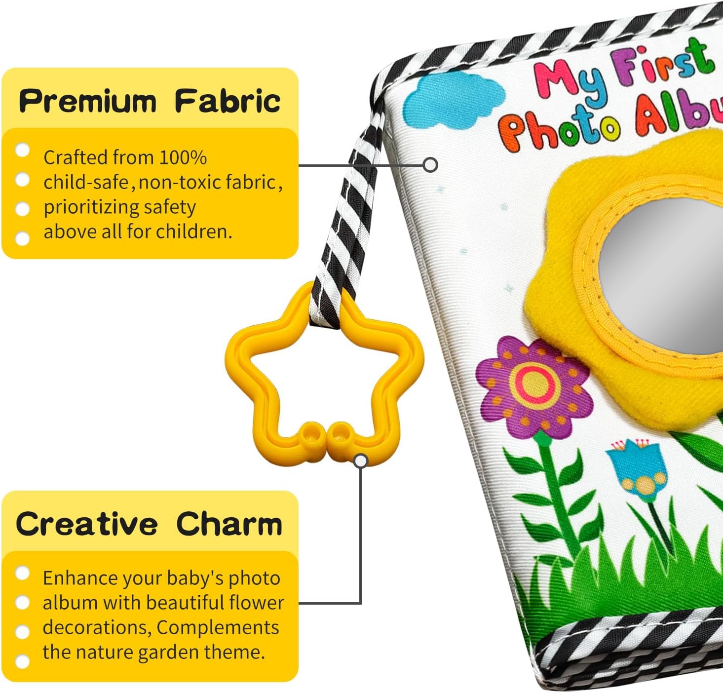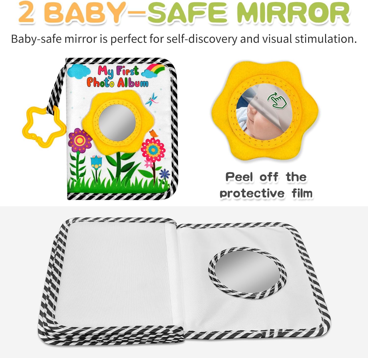 Fully Functional:My First Photo Book for Baby with an extra baby safety mirror and Star-shaped rubber ring,baby safety mirror can stimulate your child’s imagination and curiosity, Star-shaped rubber ring Can be attached to a crib and stroller.