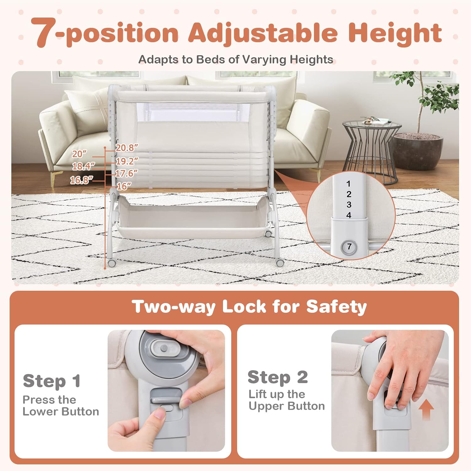 [ Adjustable Height ]: The baby bedside sleeper has 7-position adjustable height that adapts to beds of varying heights. You can alter the height easily with the two-way lock for safety (Step 1: Press the lower button. Step 2: Lift up the upper button).