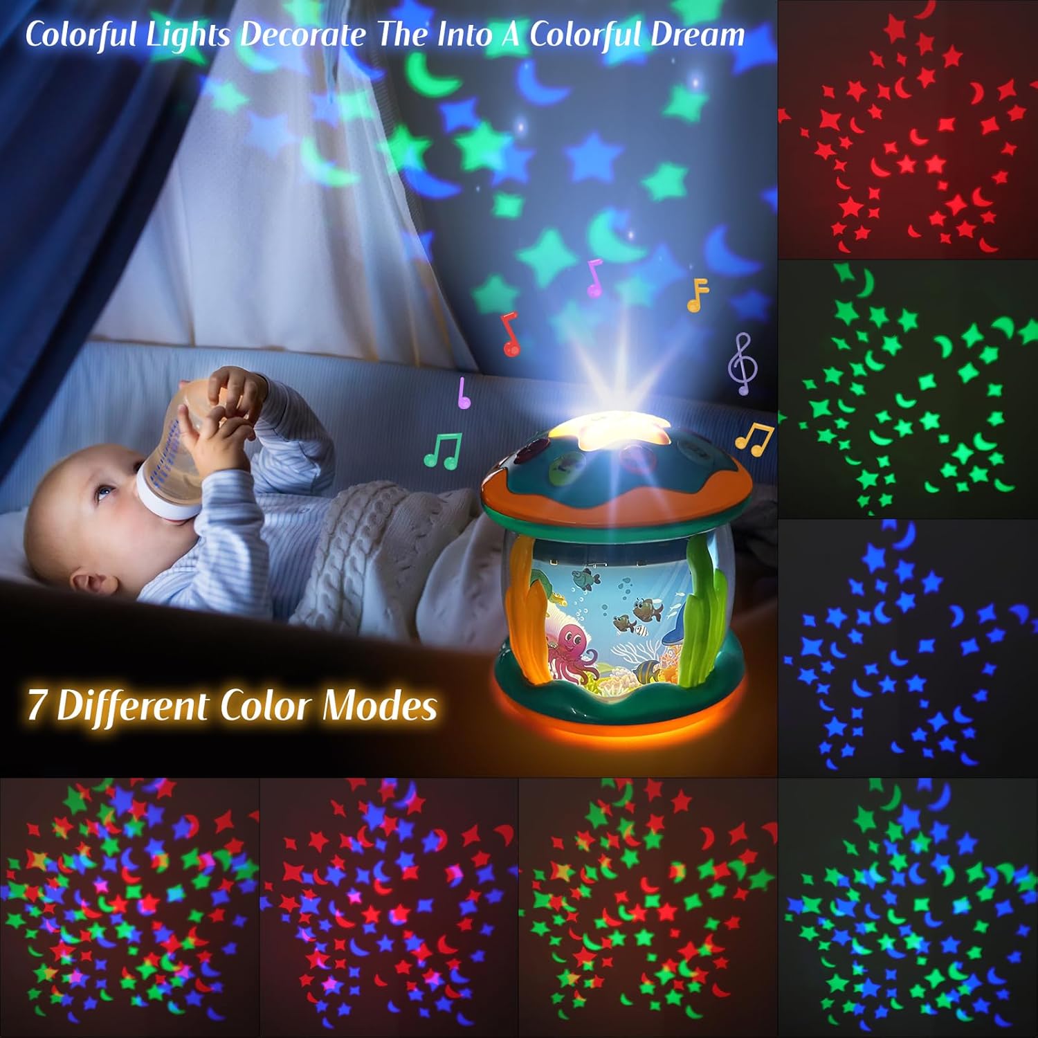 【360 Degree Ocean World Rotation】The ocean rotating projector toys for baby tummy time, infant toys 0-3 3-6 months with various of sea animals, like dolphins, octopus, clownfish, etc. Making baby feel like they are in a fairy tale undersea world, and stimulating babies unlimited imagination.