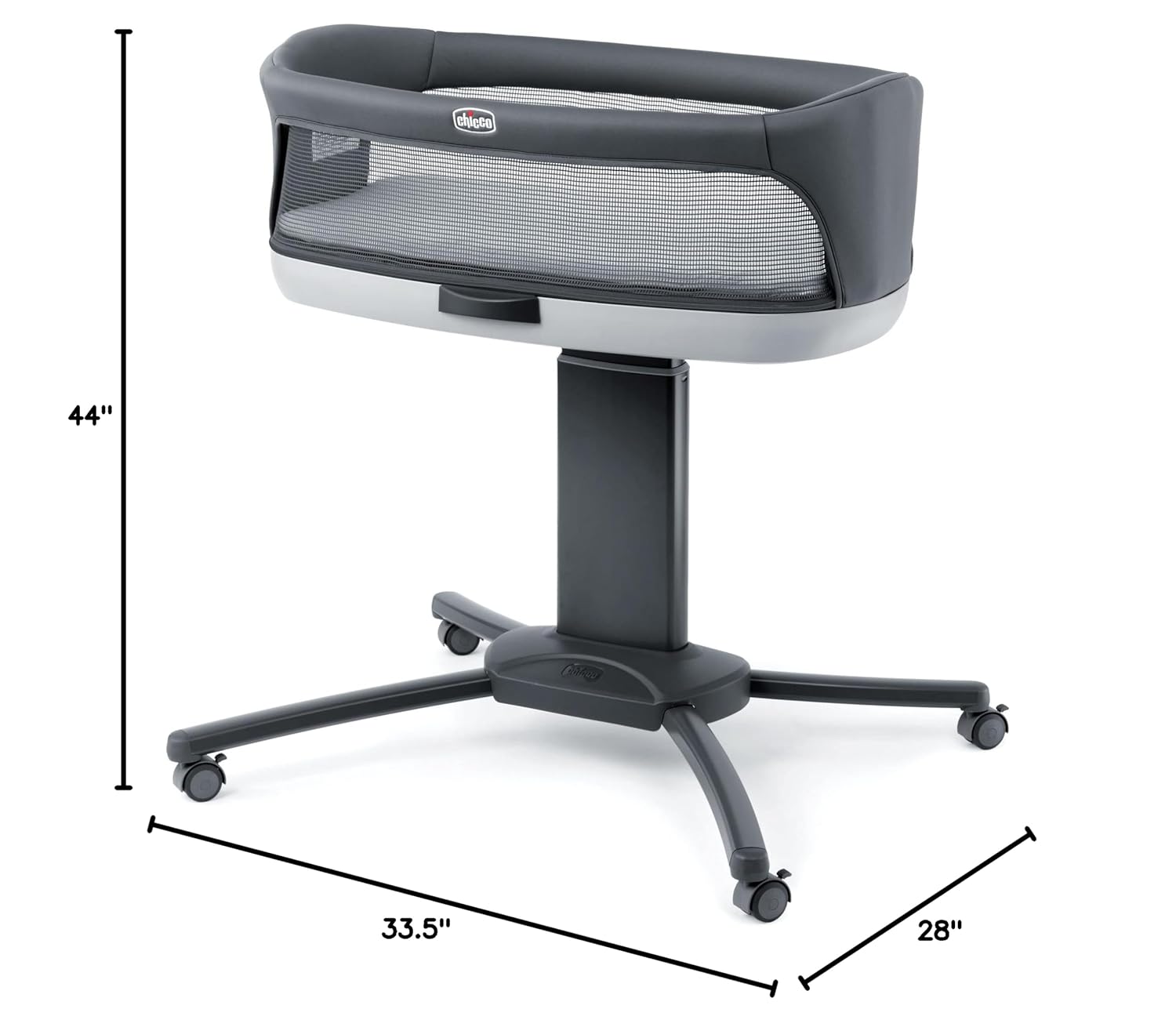 A newborn essential, four rubberized swivel wheels and a range of height adjustments (21.5”-30.5”) allow you to easily maneuver the bassinet and glide it over the bed for close, comfortable sleep. The sturdy, level bassinet features soft mesh sides for visibility and airflow.