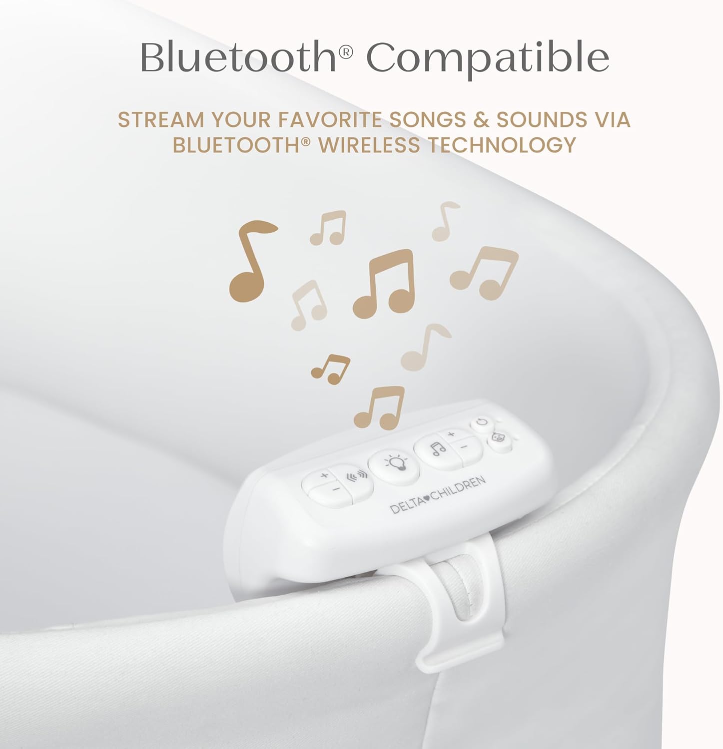 DELTA CHILDREN CONNECT APP: Customize your baby’s sleep environment with over 1,200 combinations that can be easily set in the Delta Children Connect App | Bassinet has 7 soothing sounds, 3 lullabies, 6 auto-glide speeds and 3 illumination options