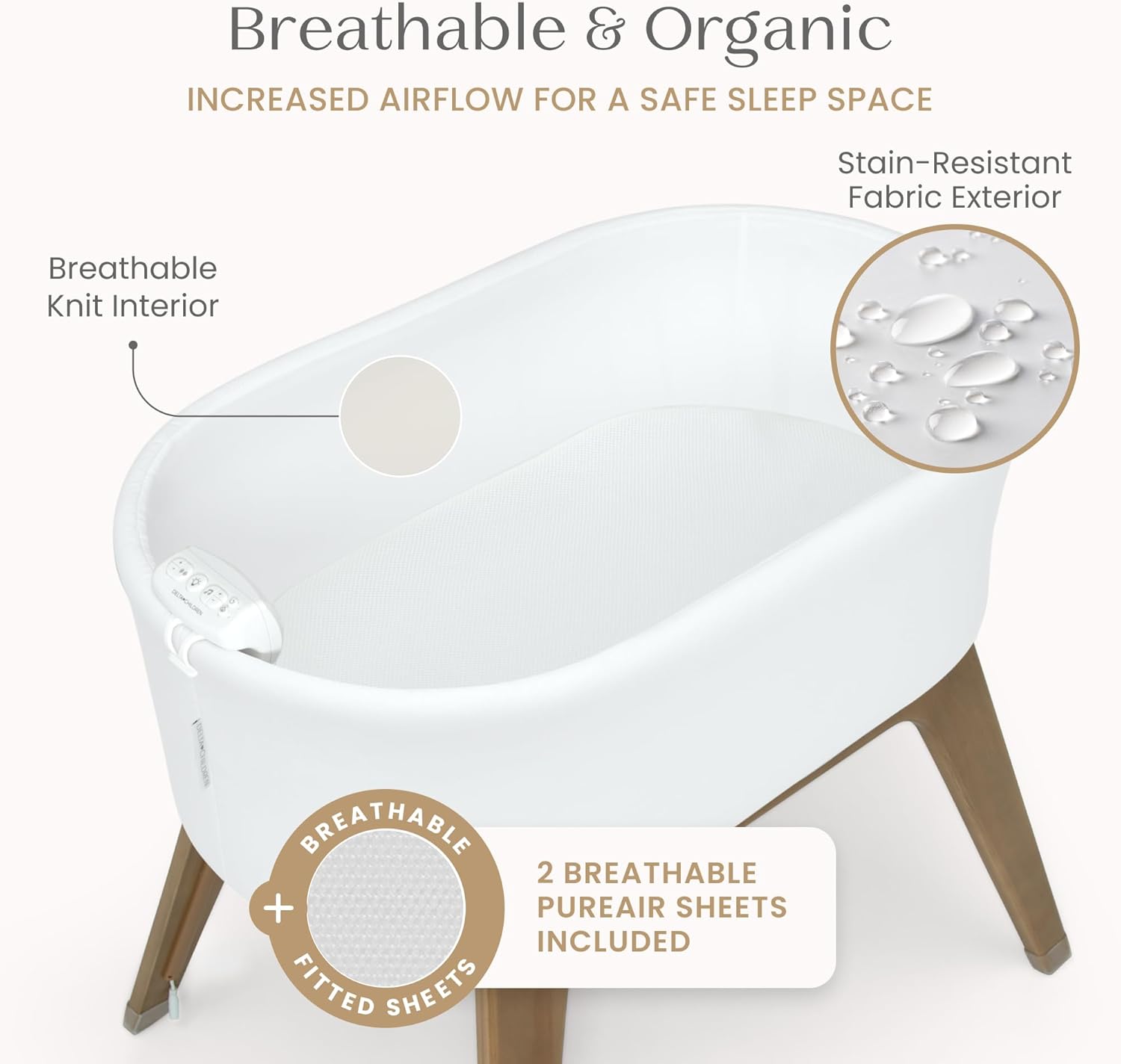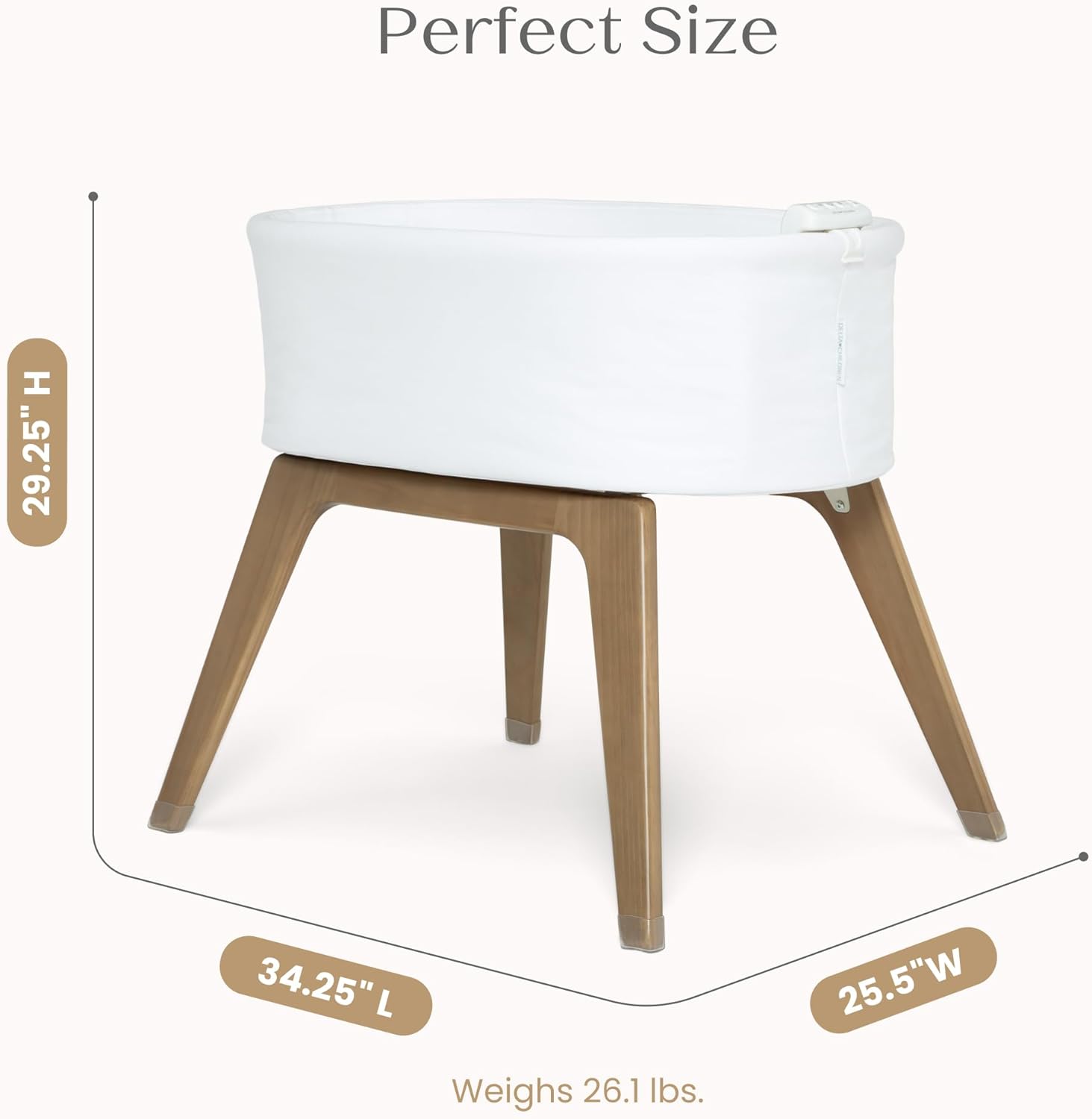 The Delta Children Aero Smart Auto Glide Bassinet hears your baby’s cries and automatically responds with advanced cry detection technology that activates a soothing side-to-side gliding motion, lullabies or sounds, and calming amber light that supports healthy sleep patterns and prevents overstimulation. Customize your baby’s ideal sleep environment with over 1,200 setting combinations that you can control directly in the Delta Children Connect App. Parents can also stream any song via Bluetooth wireless technology. The patent-pending magnetic auto-glide feature offers the quietest and most reliable glide motion on the market, beating out the competition that still uses nosey motors. A breathable knit interior, stain-resistant, 100% organic, GOTS Certified fabric exterior, included PureAir Fitted Sheets and water-resistant mattress pad help create a safe and serene space for your baby. Its sleek aesthetic and FSC-certified wood legs that help support healthy forests and ecosystems, seamlessly fits with your home’s decor. This bassinet is recommended for babies 0-5 months. Max weight 30 lbs. Stop use at 5 months or once your infant begins to push up on their hands and knees, whichever comes first.