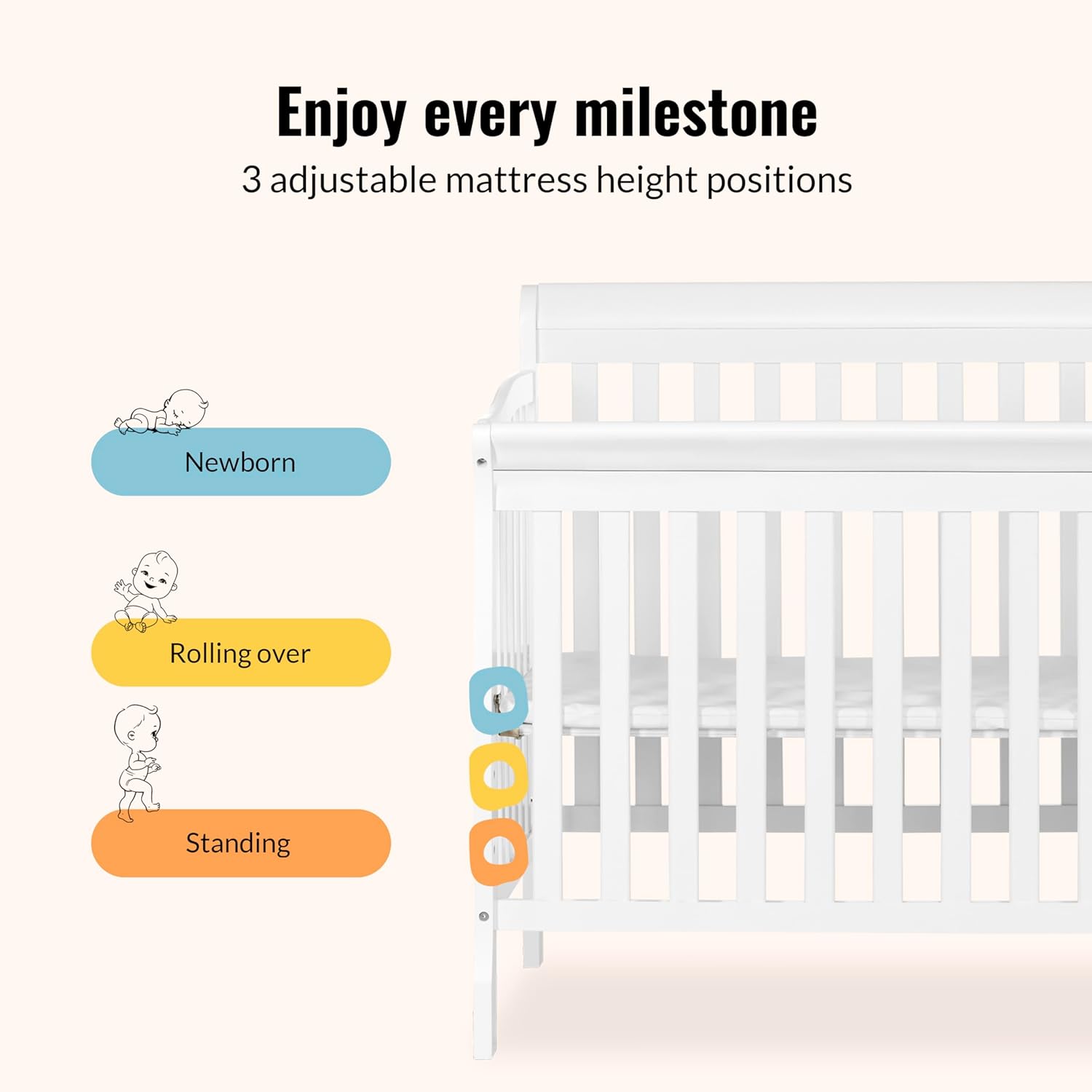 Dream On Me Jayden 4‑in‑1 Mini Convertible Baby Crib & Changer with Storage in White, Pinewood, GreenGuard Gold & JPMA, 1” Mattress Pad, 3 Mattress Heights, Converts to Mini Day & Twin-Size Bed