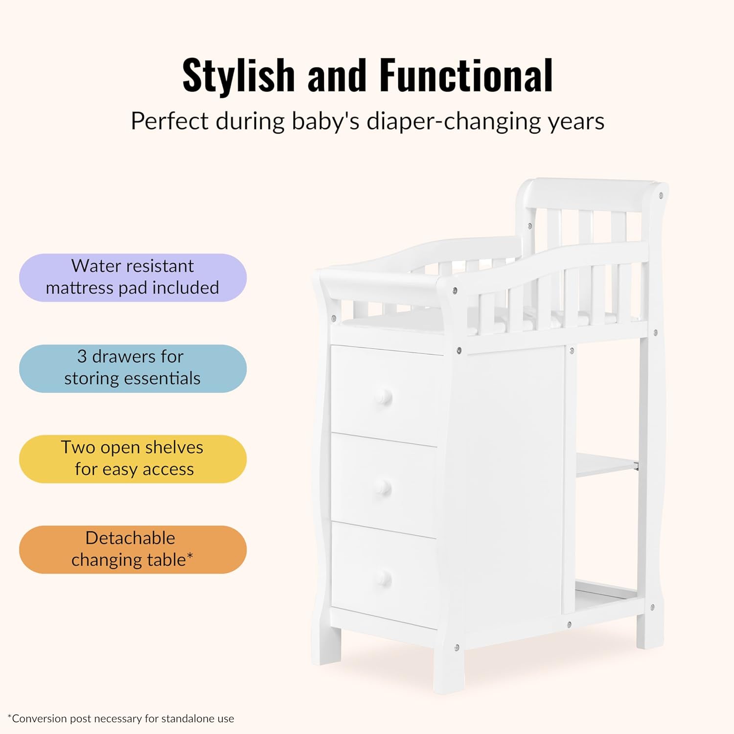 FEATURE-HEAVY CHANGING TABLE: The Jayden comes with a detachable 3-drawer changing table, equipped with a changing pad and restraining strap with an easy release buckle to keep your baby safely secured. Keep baby essentials handy and neatly organized in the 3 roomy drawers