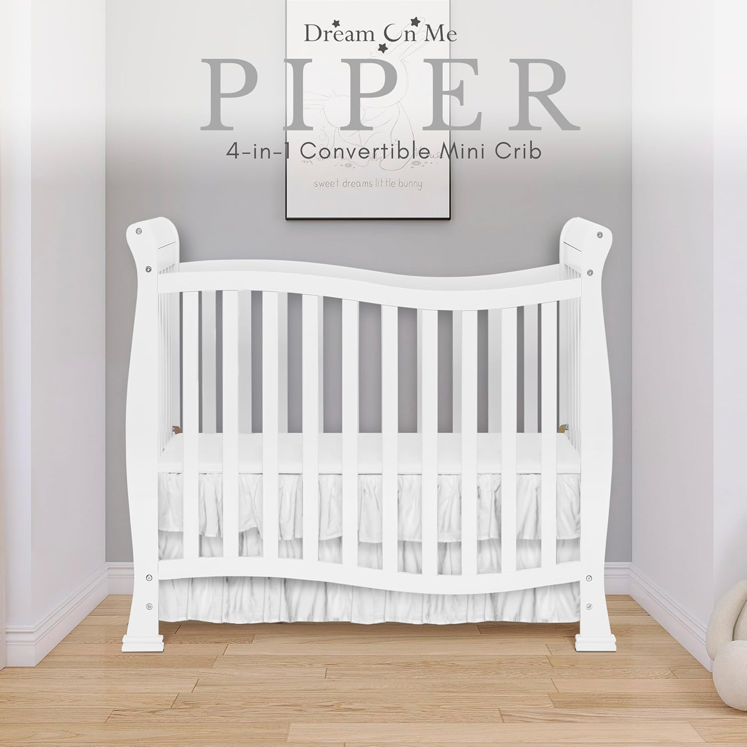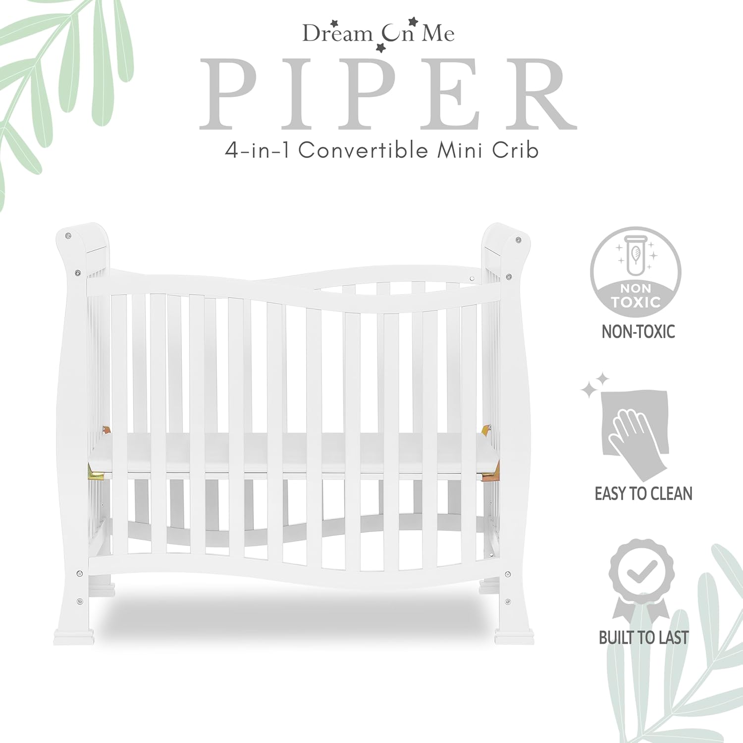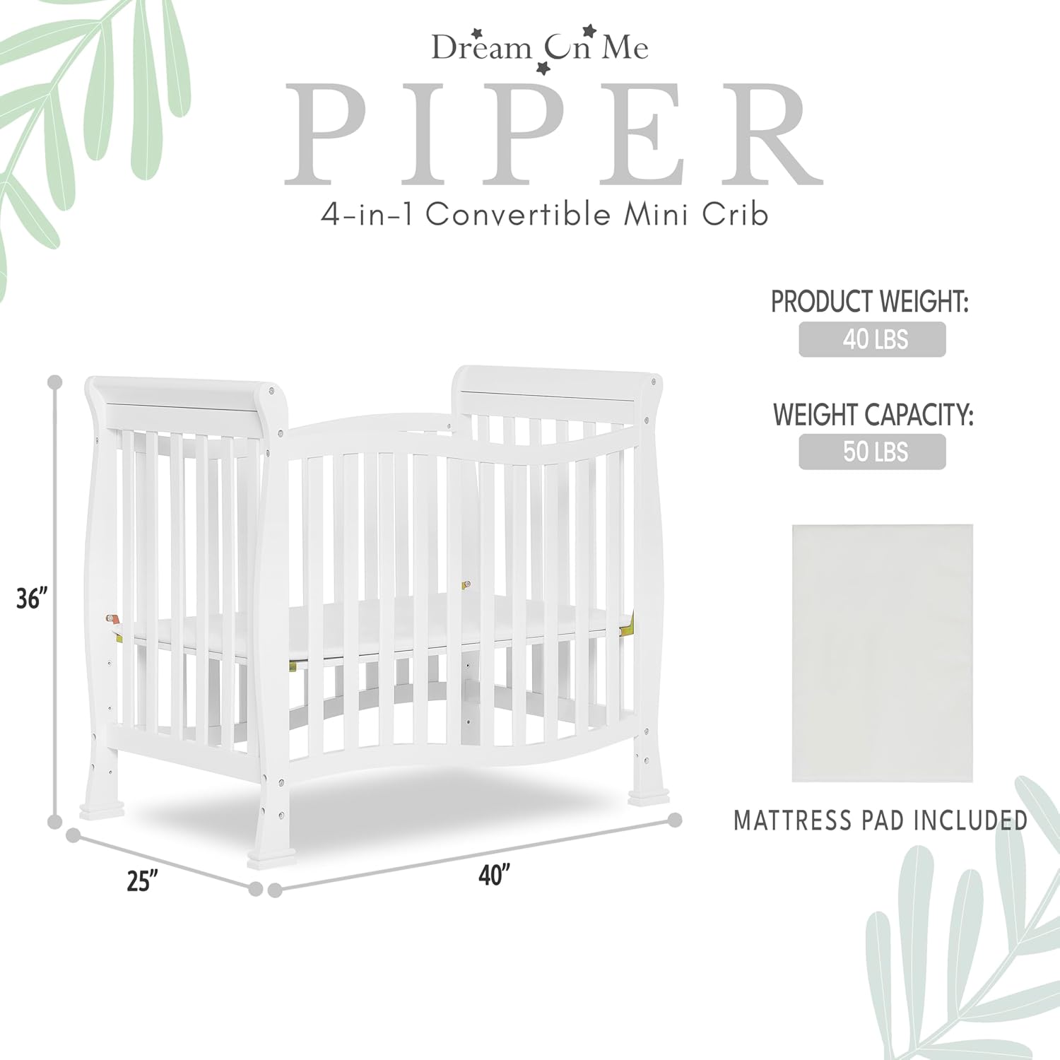 The Violet 4-in-1 Convertible Mini Crib is the perfect nursery solution for small spaces and to keep pace with the changing needs of your growing child. Starting as a mini crib, you can convert it into a mini daybed and twin-size bed (bed rails sold separately).Built of solid pinewood, the Violet attracts with a flowing and curvy design. Minimalist with a small footprint, it is ideal to make the most of small spaces or when you are co-sharing with your baby. You can choose from pleasant non-toxic, water based paint finishes and create a stylish space for your child.The Violet has a 3-position adjustable mattress height setting that you can adjust as your child grows. It comes with the regulatory 1” mattress pad. Choose a Dream On Me non-toxic, Greenguard Gold certified mini or portable crib mattress for a perfect fit. At Dream On Me we prioritize safety. All our cribs are JPMA certified and are tested for lead and other toxic elements to meet/exceed government and ASTM safety standards. Product dimensions are 40L x 25W x 36H inches. Maximum weight limit is 50 lbs. All tools/assembly instructions included.