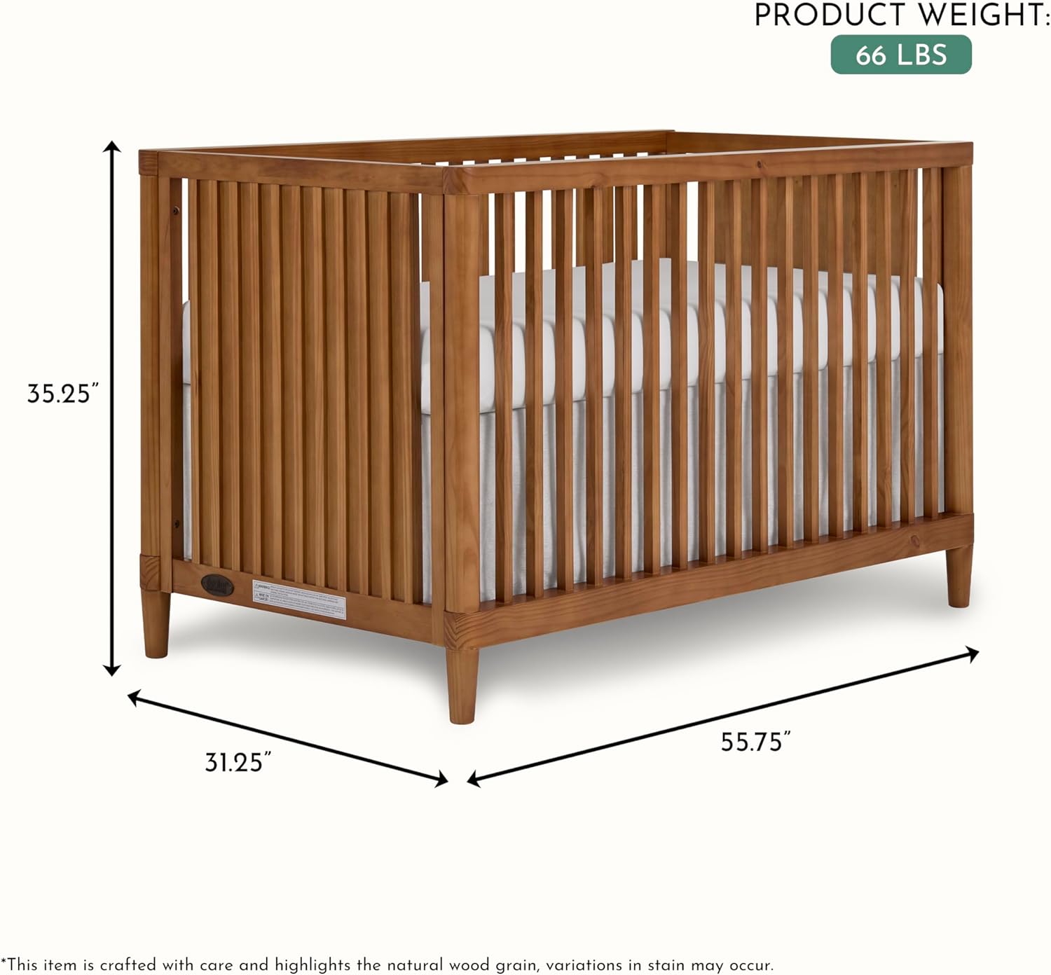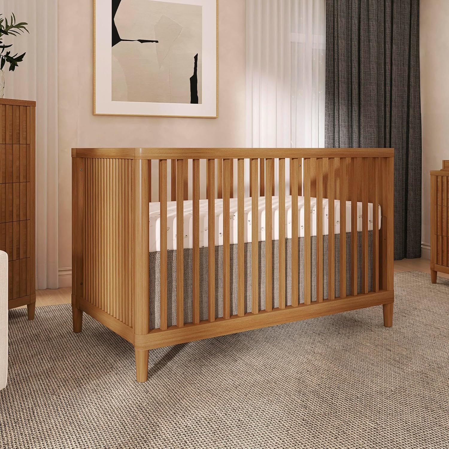 Timeless Mid-Century Inspired Design: Island-style silhouette with rounded corners and airy square spindle design. Natural wood finish offers a relaxed, organic look that suits modern, coastal, or boho nurseries.