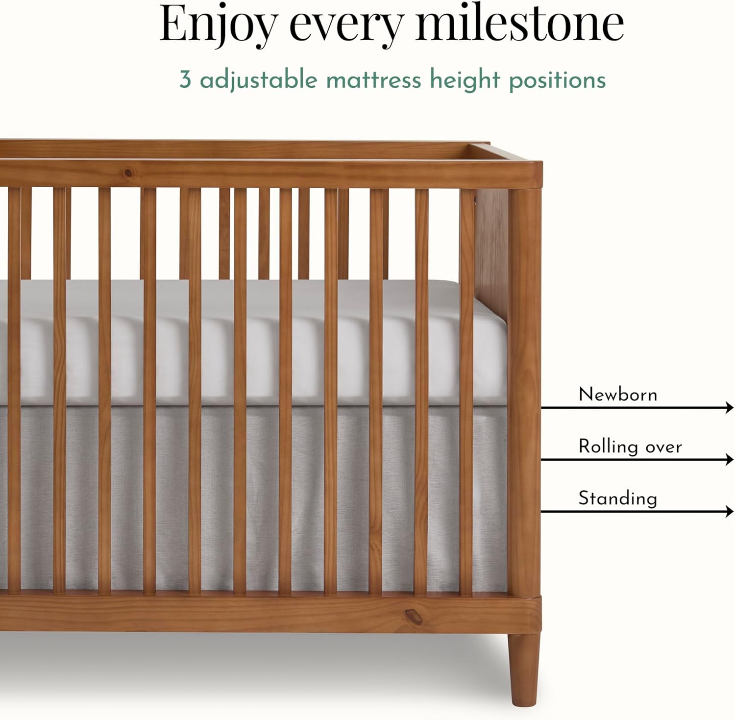 Adjustable Mattress Heights: 3-position adjustable mattress support base grows with your baby. Helps keep your child safe and secure during every stage of development.