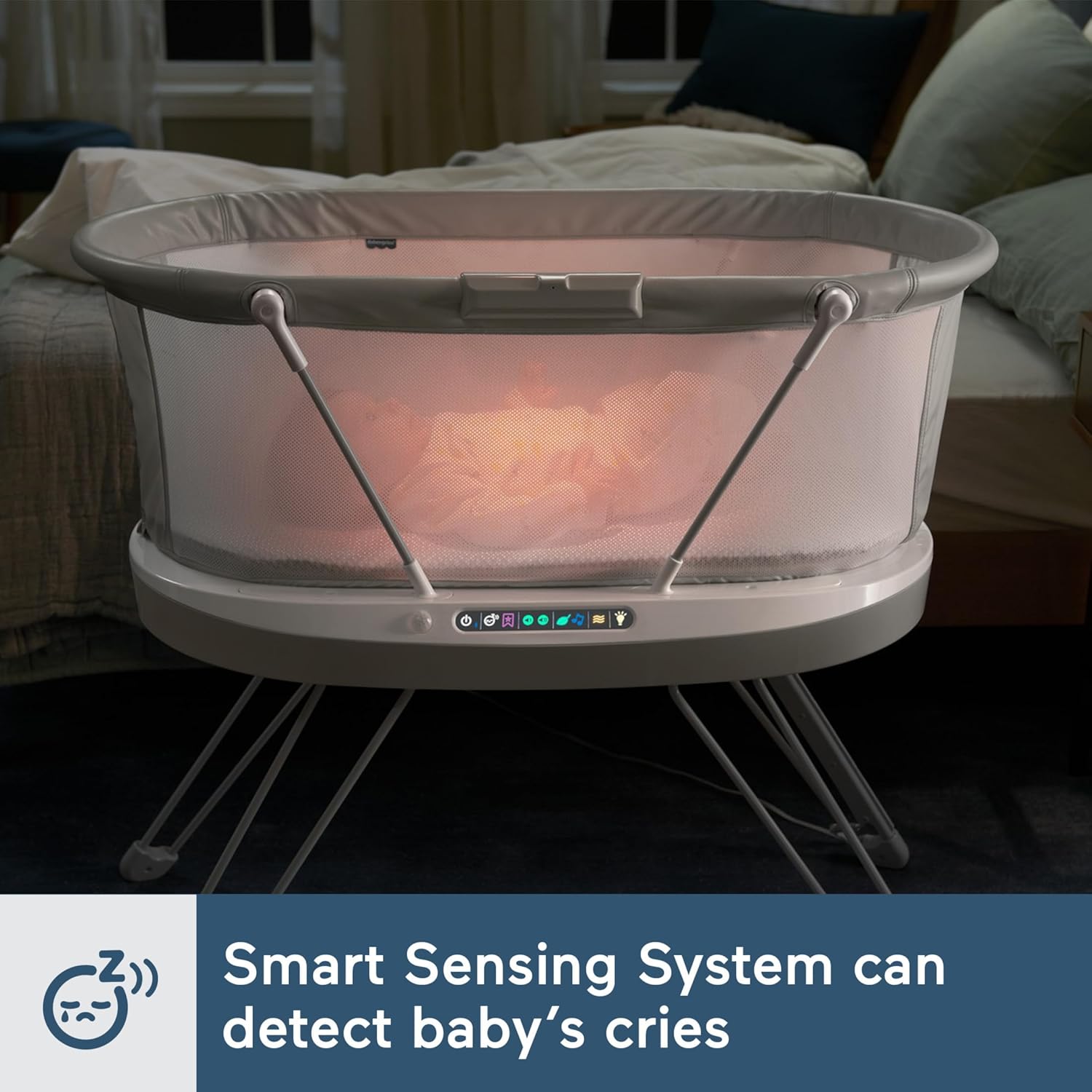Stationary bedside bassinet with built-in sound detection and customizable lights, music, white noise and vibrations controllable from a smart device with the free Smart Connect app