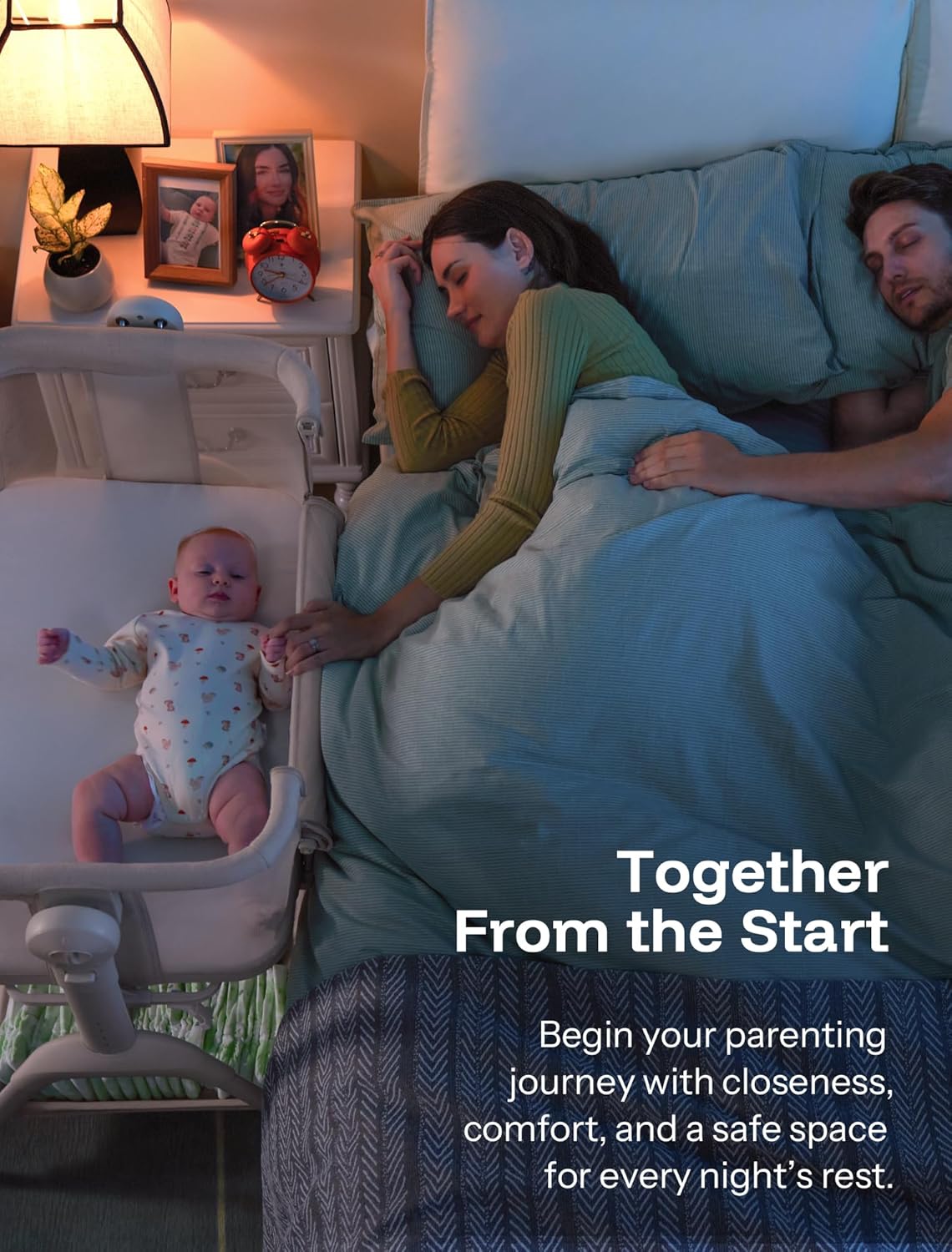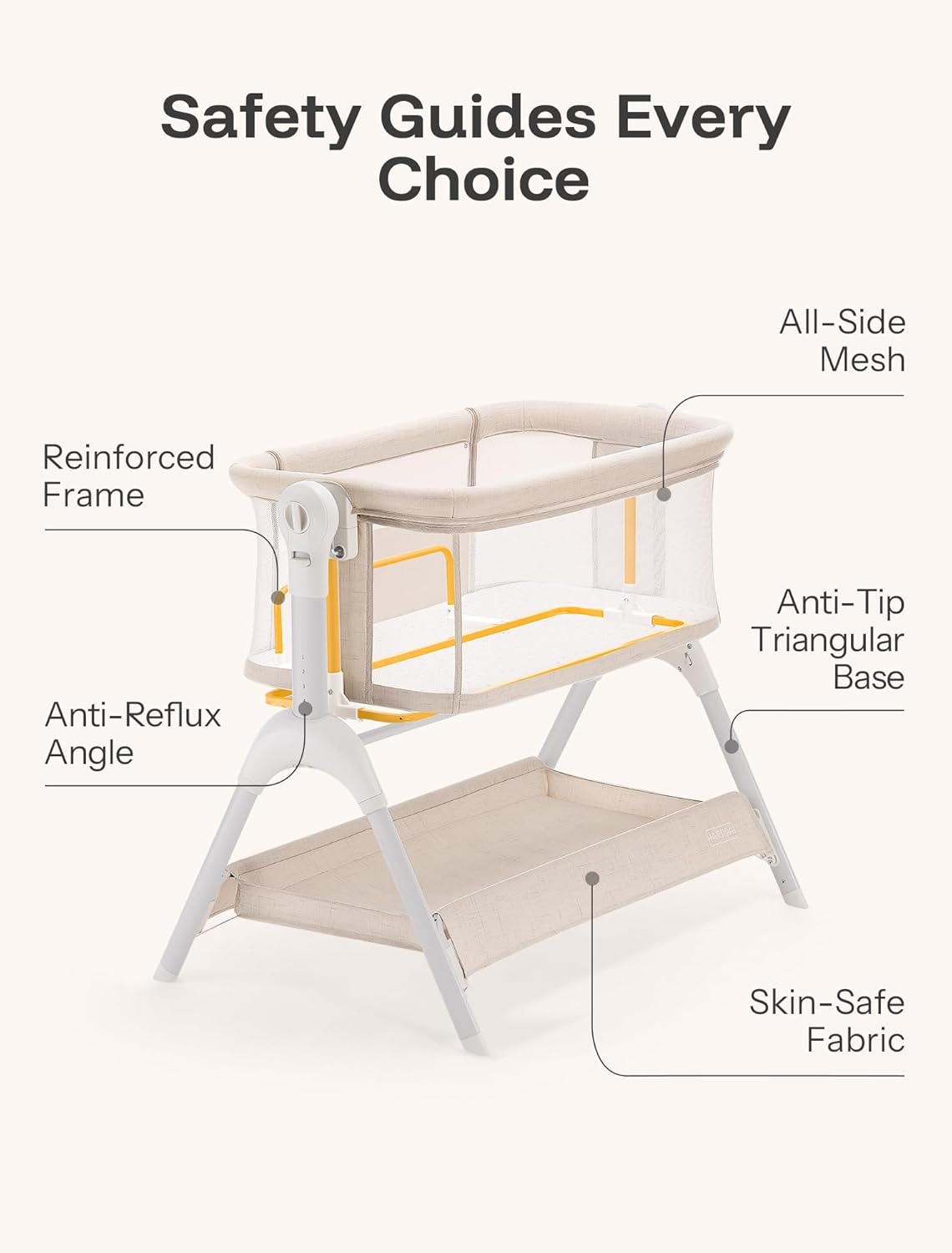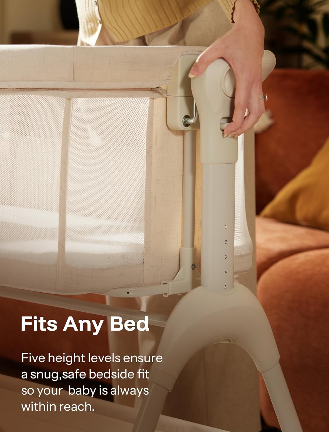 5 Adjustable Heights: Bedside bassinet with 5 adjustable height settings, ranging from 19.3IN to 22.4IN, also features an anti-spit-up function with a 3°-7° incline range