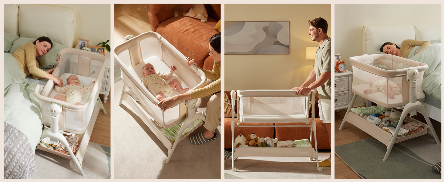 A crib is great long-term, but in the first 4–6 months babies need to be close. Cuddly Sway keeps your newborn safely at bedside, making night care easier. Travel beds are portable, but not designed for daily bedside sleep.