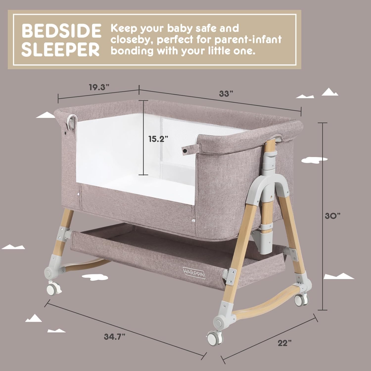HARPPA Cuddly Bassinet, 3 in 1 Baby Bassinet Bedside Sleeper, Bedside Crib with Mattress and Wheels, Breathable Mesh, 5 Height Adjustable, Anchor Strap (Wood Grain, Khaki)