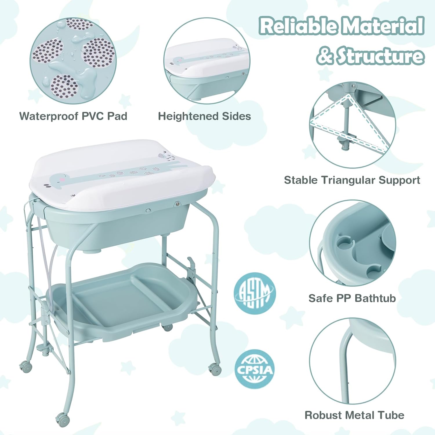 【Reliable Material & Structure】 Waterproof PVC pad and safe PP bathtub are durable, skin-friendly and easy to clean. Crafted of robust metal tube with stable triangular support, the frame ensures high sturdiness. And ergonomic height design of 41” prevents mom from back and waist pains due to long-time bending.