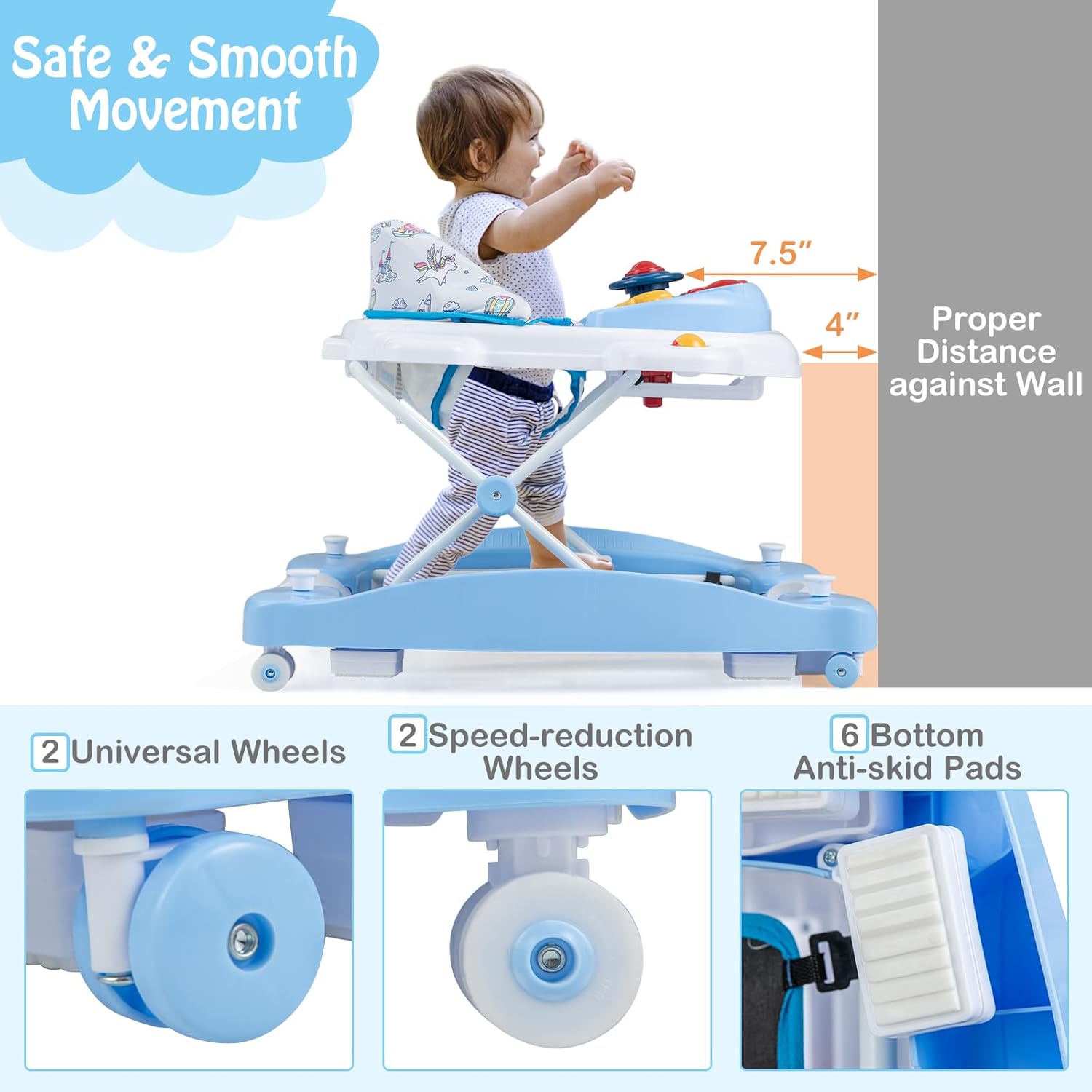 HONEY JOY Baby Walker, 6-in-1 Foldable Baby Walker and Bouncer Combo, Infant Activity Walker with Wheels, Adjustable Heights, Rocker, Music, Lights, Walker for Baby Boy Girl 7-14 Months (Blue)