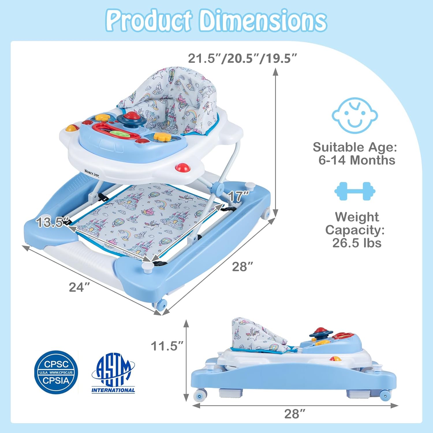 【6 in 1 Multipurpose Design】The HONEY JOY baby walker can realize 6 using modes, including jumping mode, rocking mode, baby walker mode, push behind mode, early education mode, baby eating mode, to meet the needs of different growing stages of the baby. Suitable Age: 7-14 months. Weight Capacity: 26.5 lbs.
