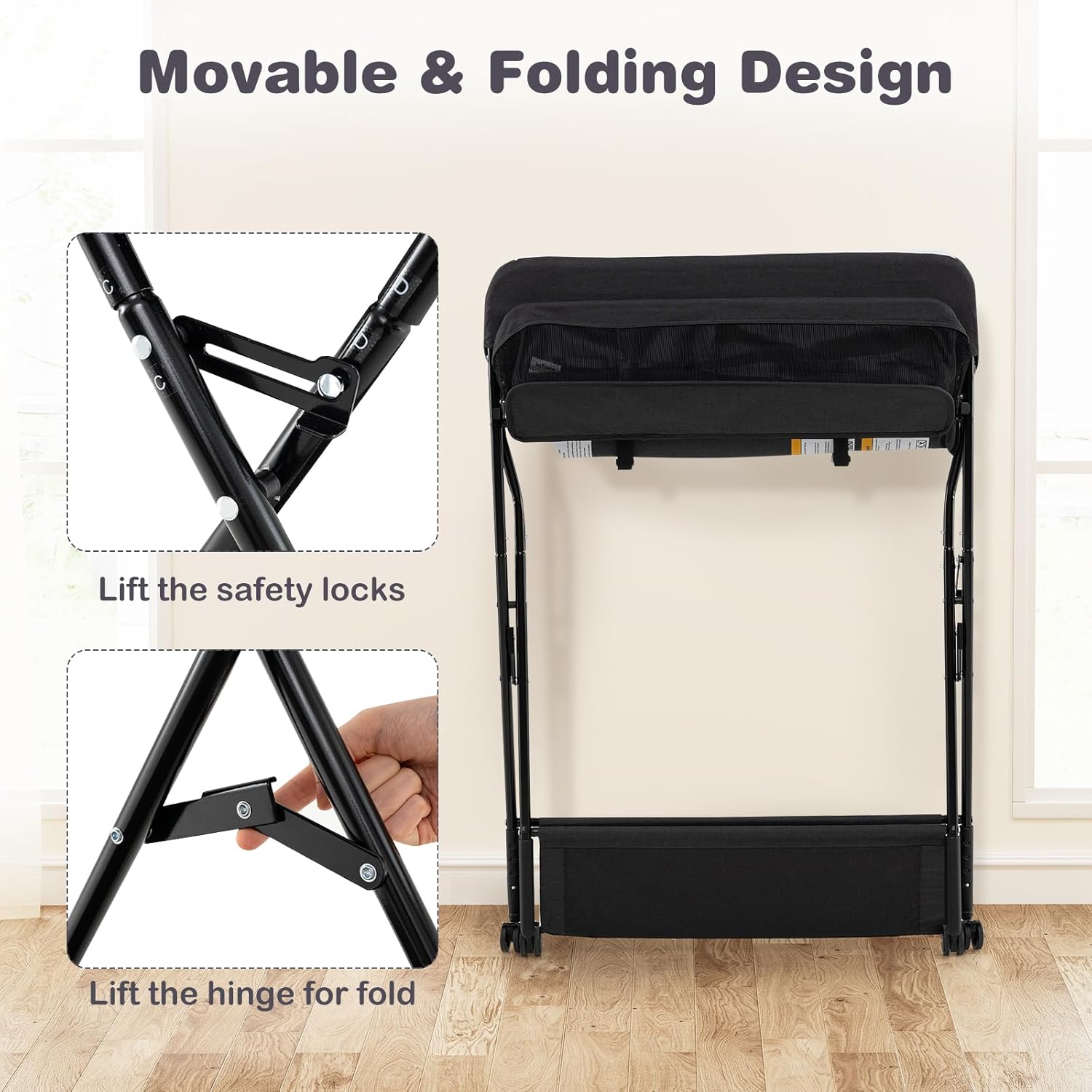 The INFANS portable changing table can be used for changing diapers, changing cloth, and massage care. The baby diaper changing table features a high-quality waterproof tabletop with a storage basket and a bottom shelf. The tabletop has a ruler for measuring the baby’s height to closely monitor the baby’s growth, as well as a safety strap to ensure the baby’s safety. This compact changing table uses a high-strength iron frame to maintain stability. The 4 adjustable heights design is suitable for family members of different heights. The folding changing table is equipped with universal wheel casters, an easy braking system. The diaper table can also be a detachable laundry rack. This infant changing table is a clean, efficient and quick solution.