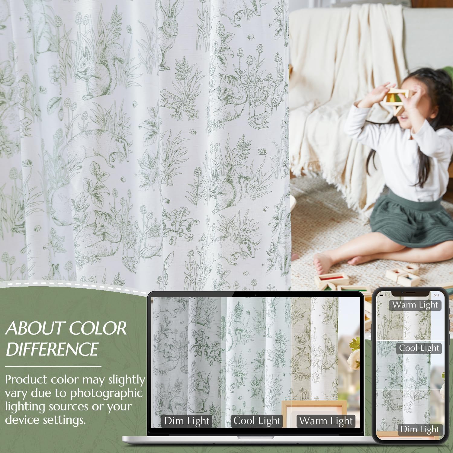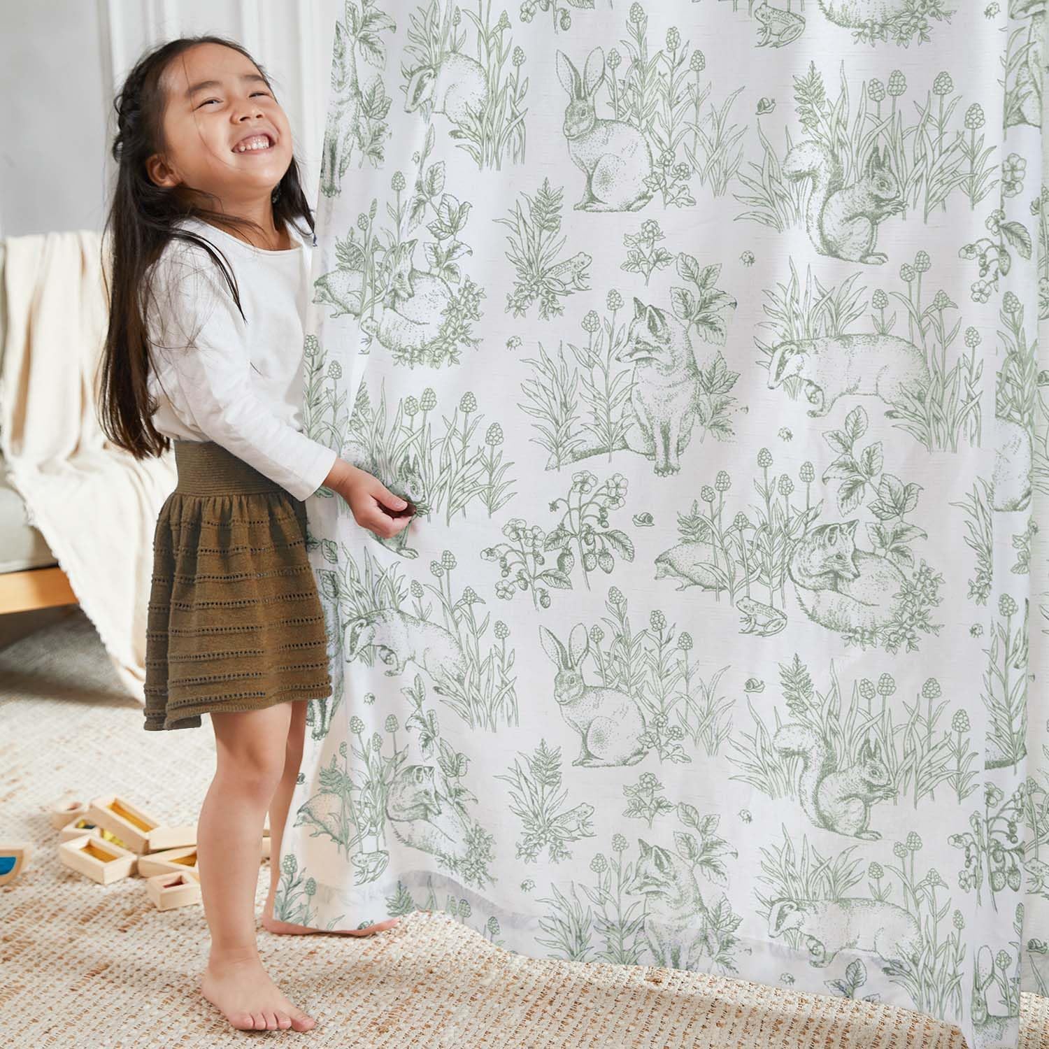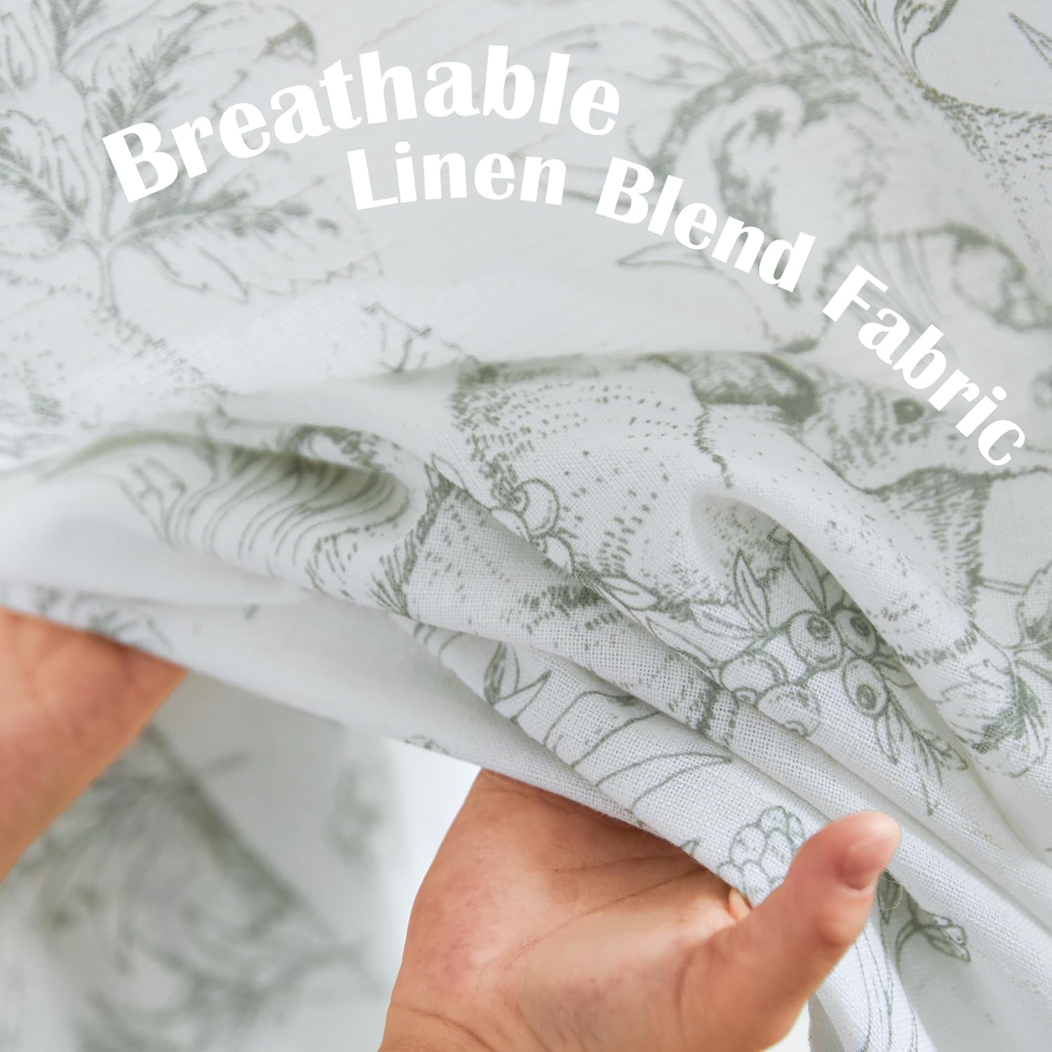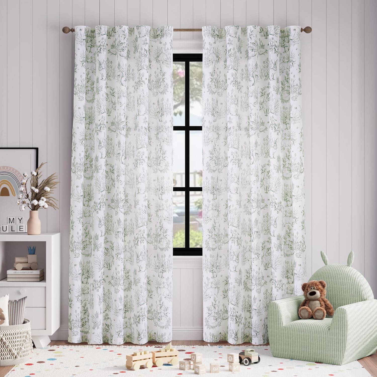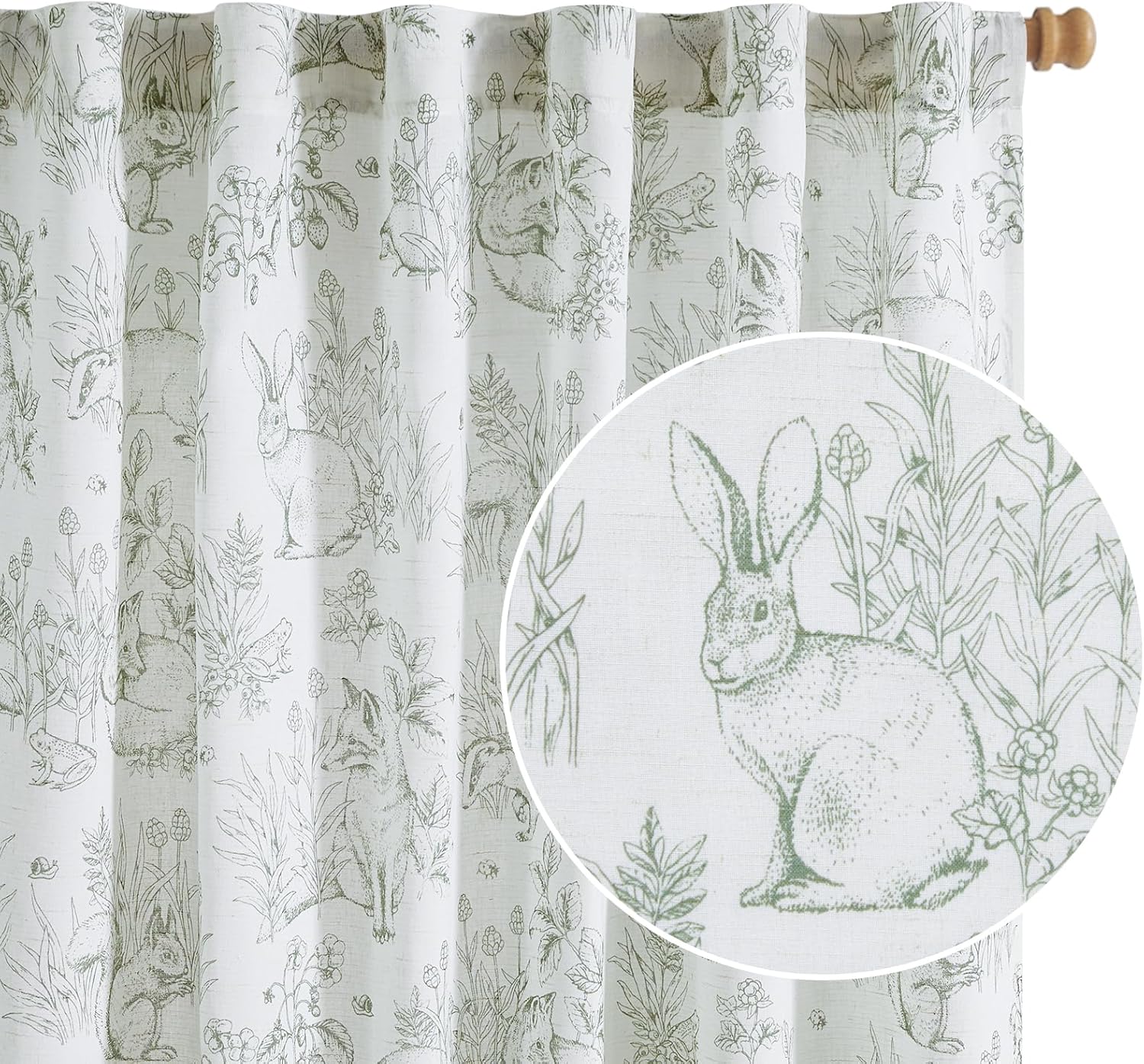 jinchan Linen Nursery Curtains 84 inch Long Woodland Wildlife Sage Green Print Drapes for Kid’s Room Light Filtering French Country Farmhouse Curtains with Bunny and Forest Design Set of 2 Panels