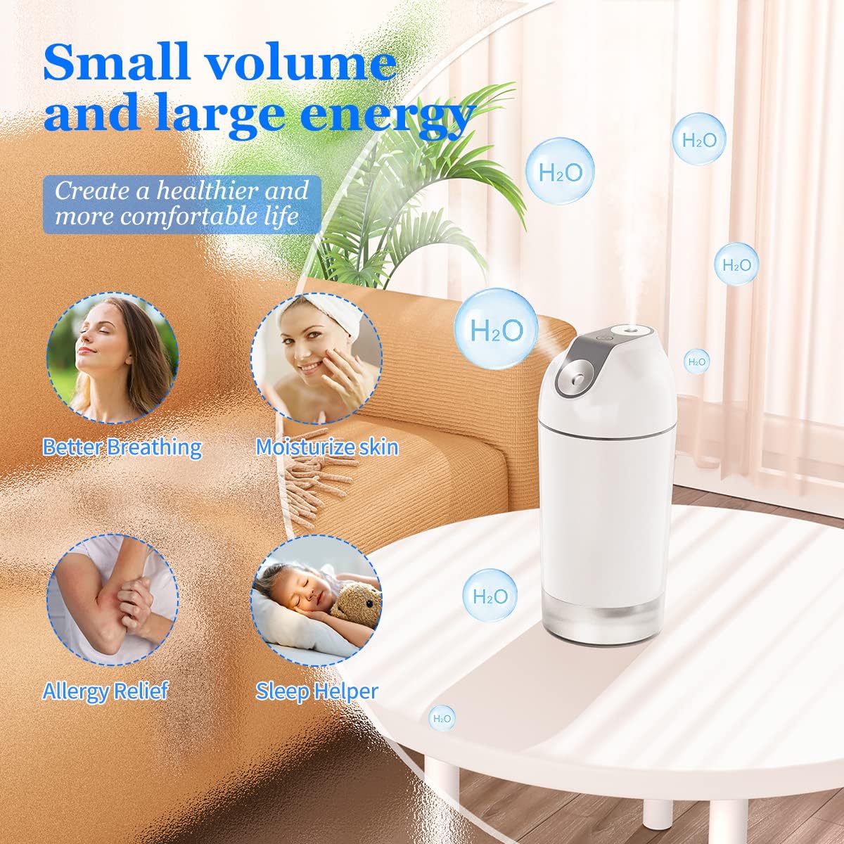 Portable Mini Humidifier: Built-in battery powered, it can be used mobile. 3″L x 3″Wx 7.8″H Cylindrical mini size, easy to carry, suitable for travel, car, desktop, office, bedroom, effectively moisturizes dry skin and relieves discomfort caused by dry air