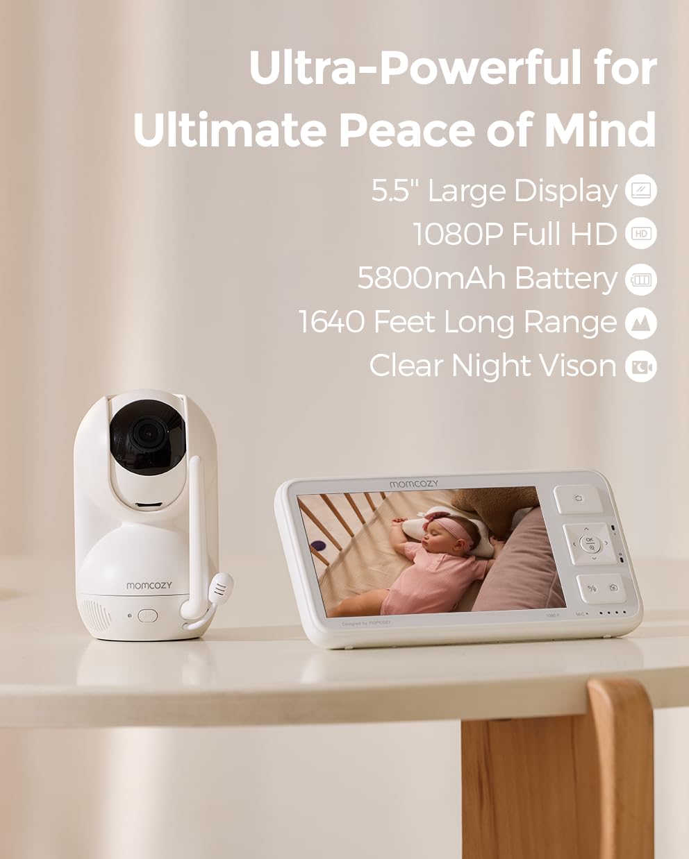 【True 1080P 5.5-Inch HD Screen】The baby camera monitor with an enlarged 5.5-inch display boasts the true 1080P Full HD resolution, offering every detail in the view.