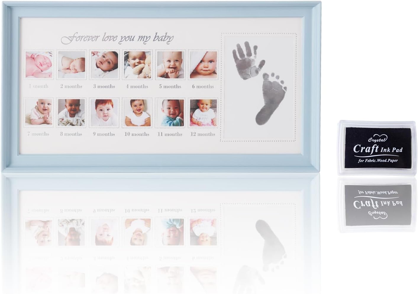 【First Year Picture Display】Includes one white frame with “forever love you my baby” print in black, below 12 small 2”W x 2”H photo inserts to show off baby’s growth from 1 months; and one large photo insert dedicated to your baby’s hand and foot photo.