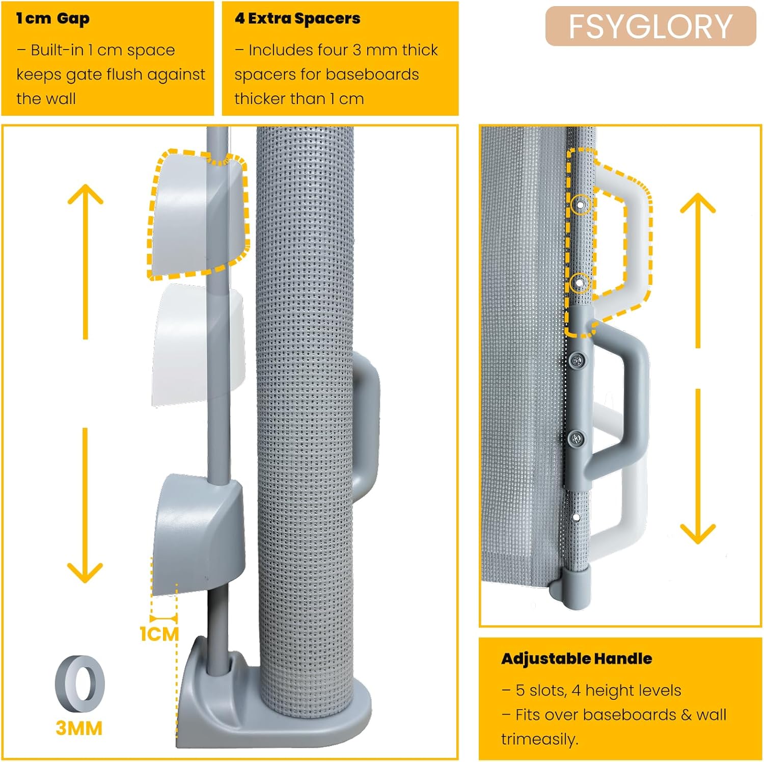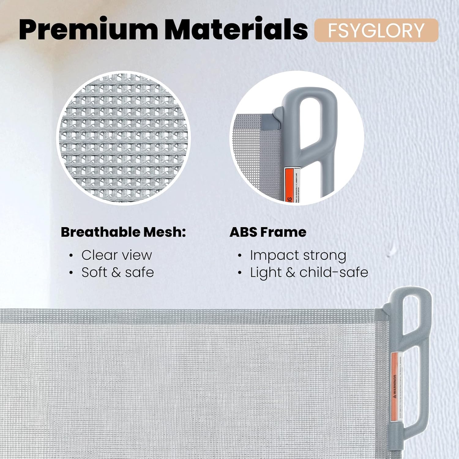 DURABLE & SOFT MESH FOR EXTRA SAFETY:Made of sturdy yet gentle mesh fabric—safe for babies’ little hands and pets’ paws. No bottom bar means no tripping hazard, making it safer to carry your baby or walk freely through the gate