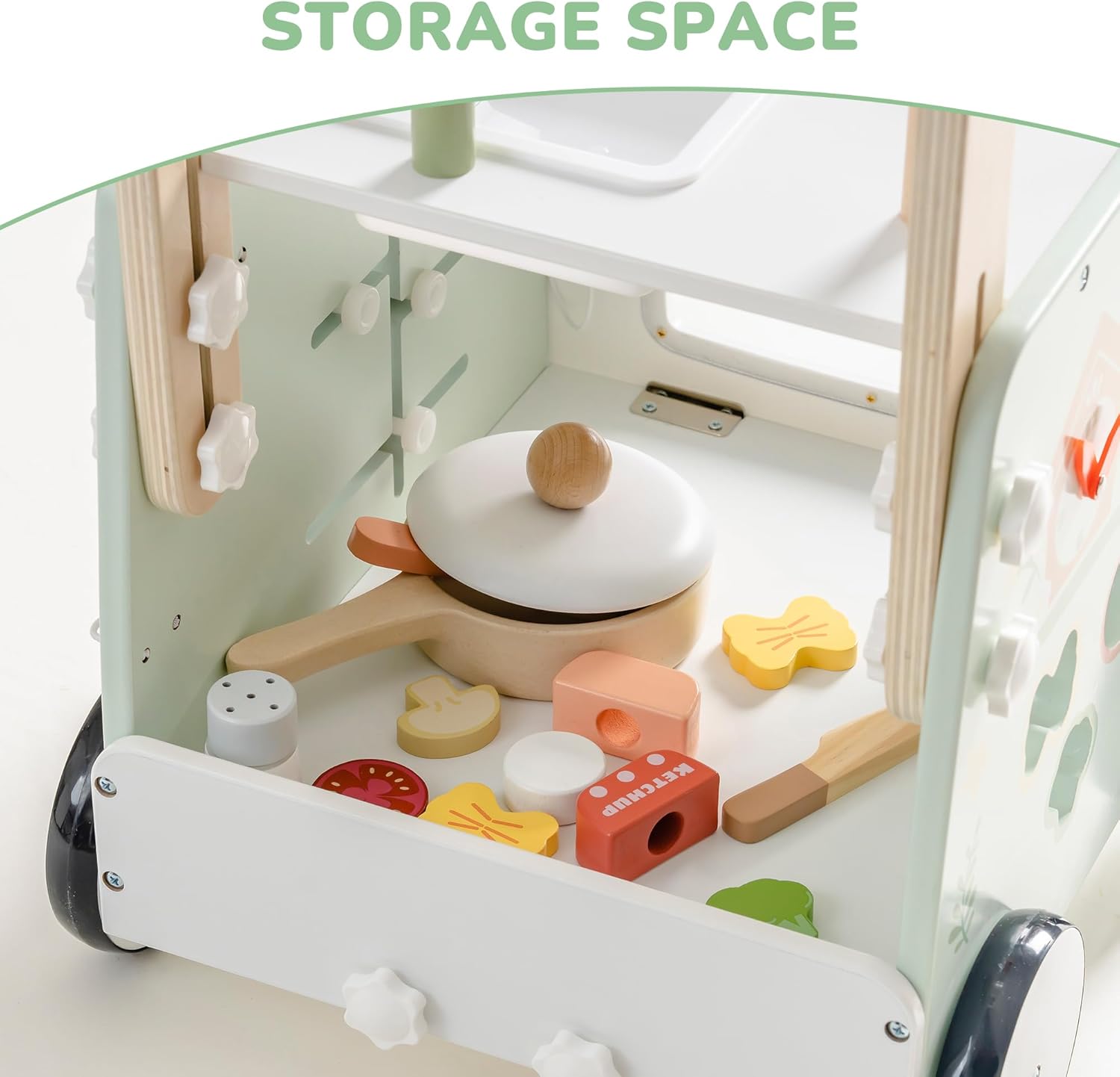 Modern and Engaging Aesthetic: With its fresh green color schemes and charming patterns, this baby walking toy is visually appealing and adds springtime vibes to your home. The toddler walker push toy with light food cooking kitchen with oven design sparks child’s curiosity and keeps toddlers entertained, making it a perfect addition to any playroom or living space.