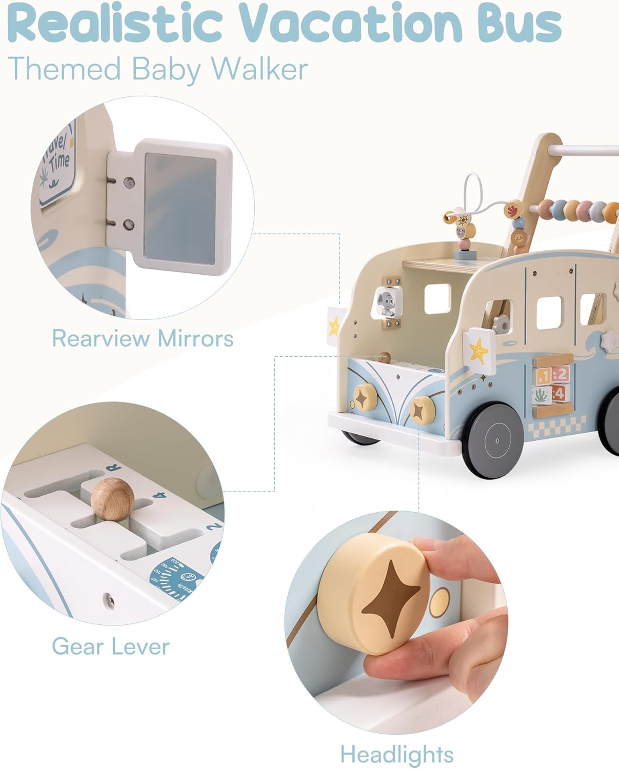ROBOTIME Wooden Baby Walker, Baby Push Walker, Baby Activity Center Toys, Ajustable Speed Multi-Functional Baby Walker with Wheels for Boys and Girls(Vacation Bus)