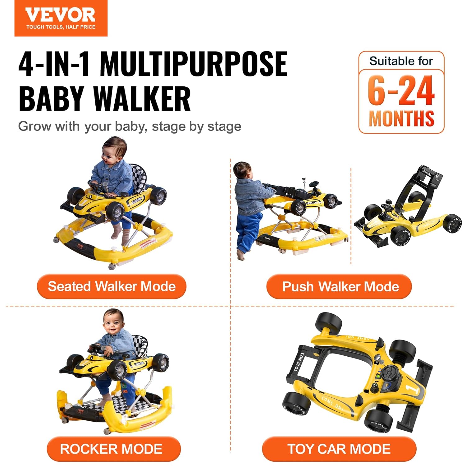 VEVOR 4-in-1 Baby Walker, Foldable Baby Activity Center on Wheels, Adjustable Height, Light, Steering Wheel, Car Shape | Learning-Seated | Walk-Behind | Rocker Toddler Walker for 6-24 Month Boys Girls
