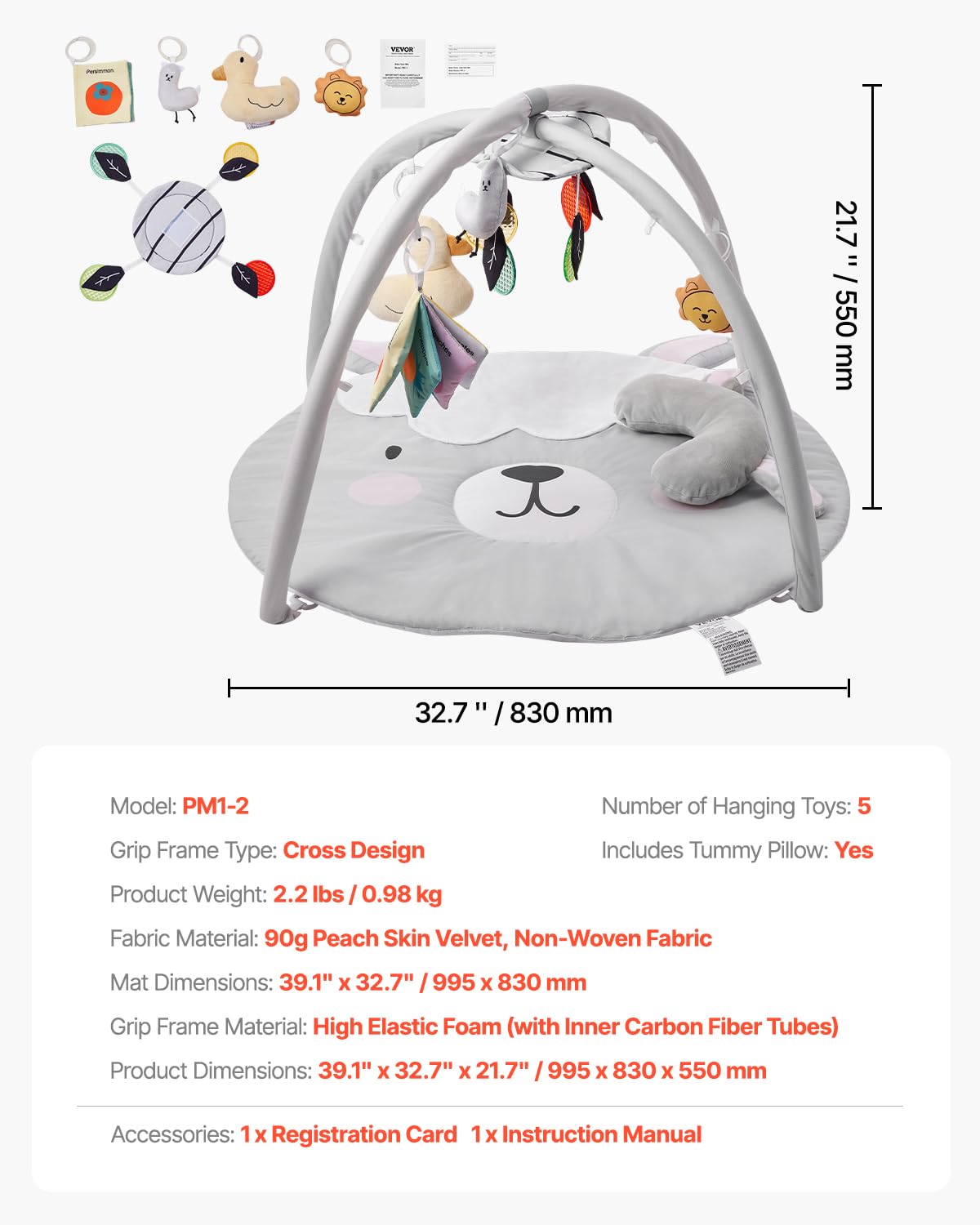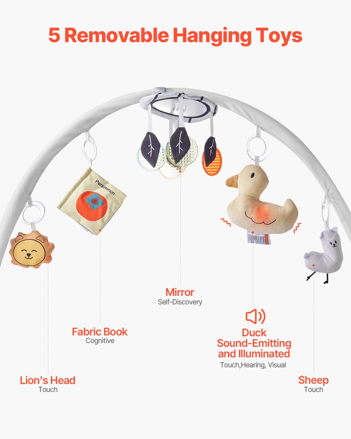 VEVOR Baby Play Gym Mat, Tummy Time Mat with 5 Sensory Toys, Baby Activity Mat with Light-up Musical Duck Toy for 0-18 Months Newborn Infant, Baby Essential Gift for Sensory & Motor Skill Development