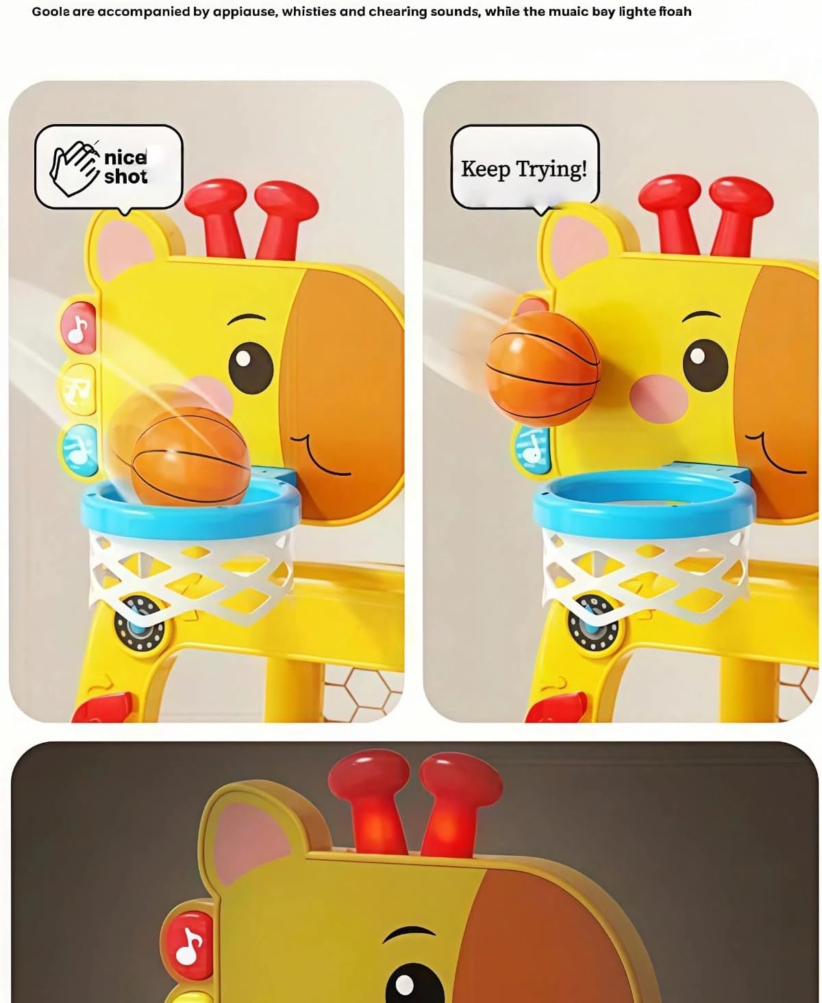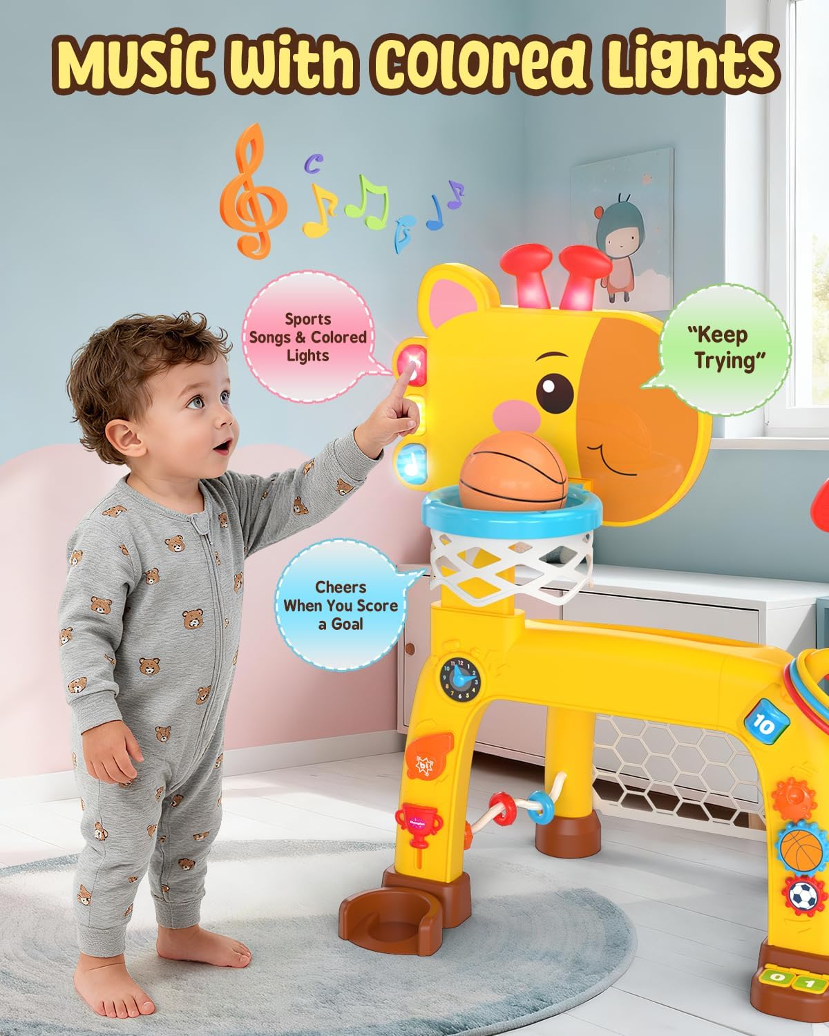【Colorful Flashlights | 22 Sounds & Songs | Adjustable Volume | Bilingual】This baby basketball hoop for kids ages 1+ plays different sounds or music with colorful flashing lights in various modes—triggered when pressing the music buttons, making a basket, hitting the backboard, powering it on, or entering sleep mode. It comes with 8 children’s songs (activated by pressing the button), 8 basketball scoring sound effects, and 6 backboard-hitting sound effects. We’ve also included both Spanish and English options, plus 2-level volume control. More features for even better value!