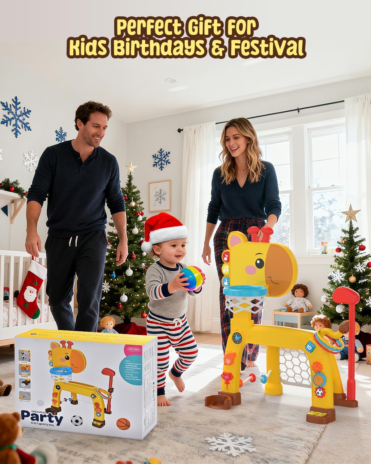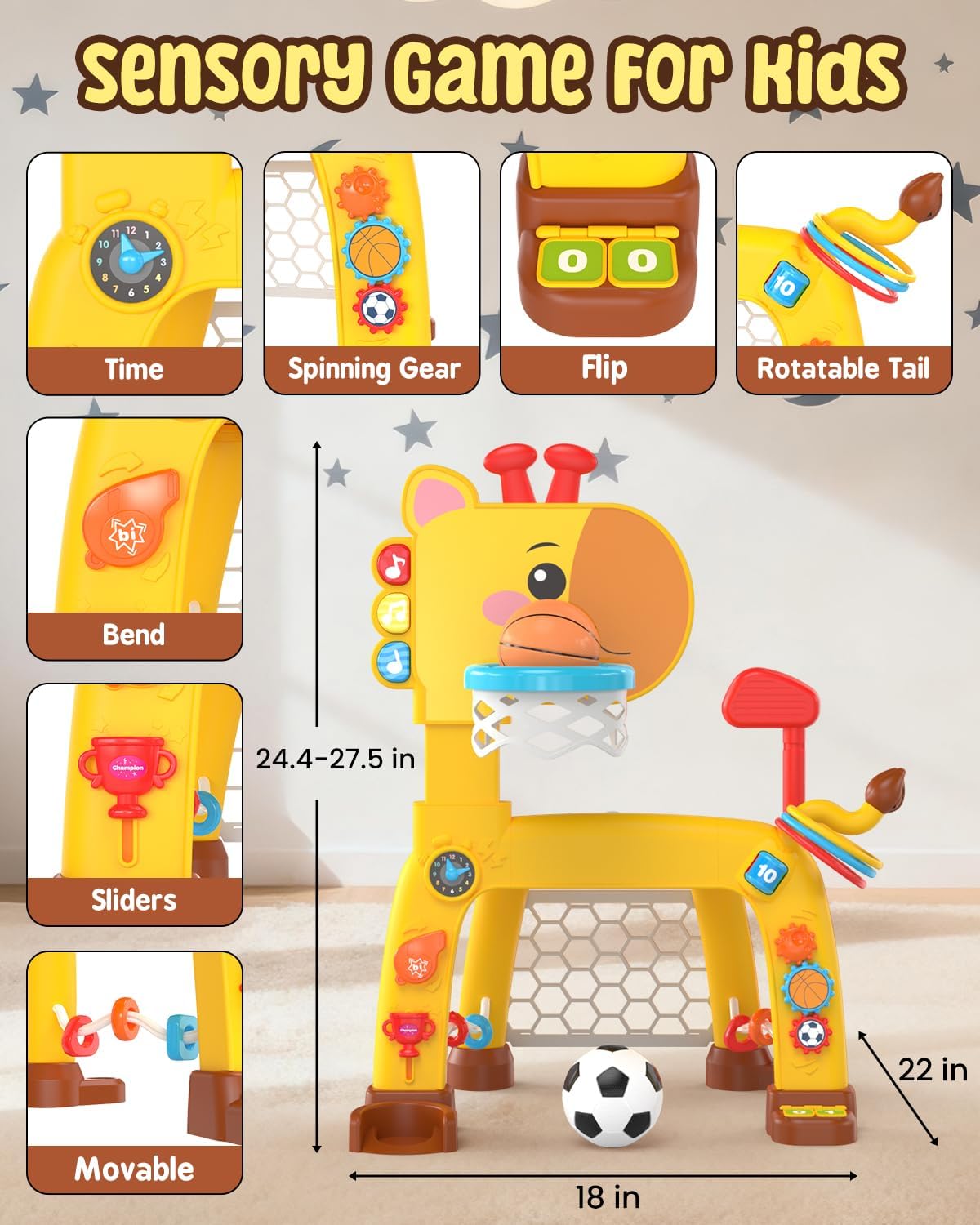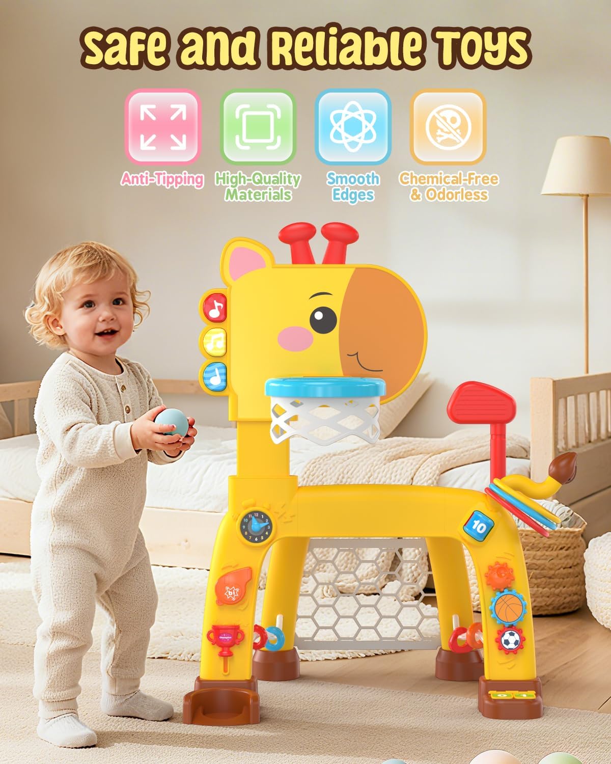 【4-IN-1 Upgraded Toddler Sports Playset】2025 Upgraded Giraffe Toddler Sports Toy Set includes the classic toddler basketball hoop & soccer goal, and we’ve added even more fun with a ring-toss game and golf set! This juguetes para niños 1 a 2 años encourages little ones to stay active through various sports activities—helping them build motor skills while keeping screen time at bay.