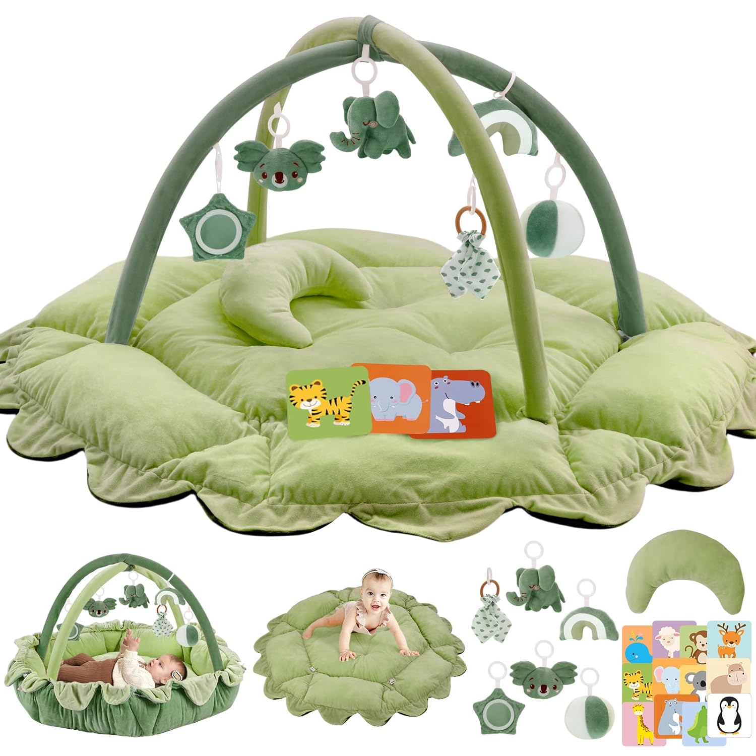 7 INTELLIGENCE-BUILDING BABY TOYS&TUMMY TIME PILLOW: Enhance your baby’s development with our spacious tummy time mat, made from premium cotton for comfort and durability. It features 6 detachable sensory toys, including a koala, elephant, and rainbow, to engage your baby’s senses. The set also includes Double-Side Cards for learning and a Tummy Time Pillow for neck and head support. Perfect for babies at every stage, this all-in-one play center promotes developmental milestones in a fun, safe environment.