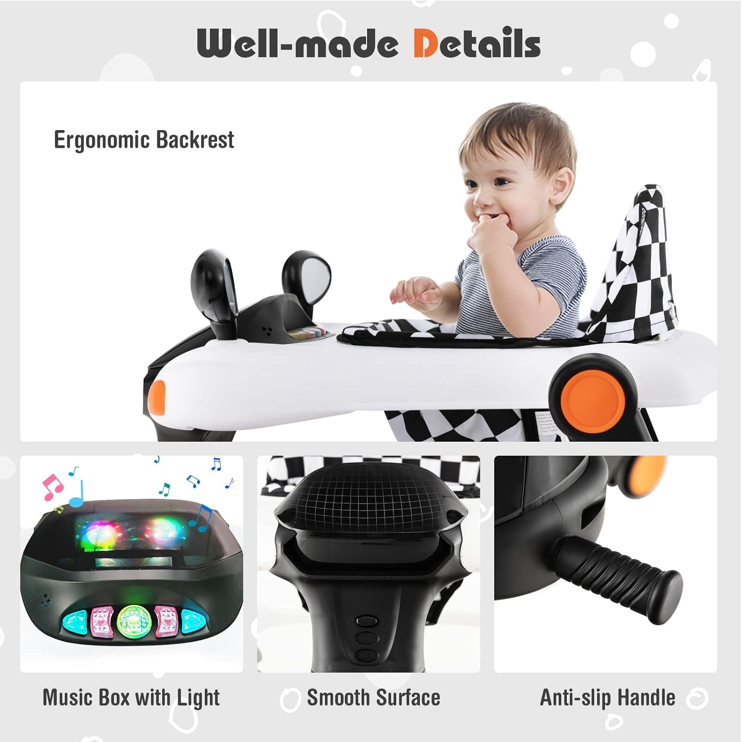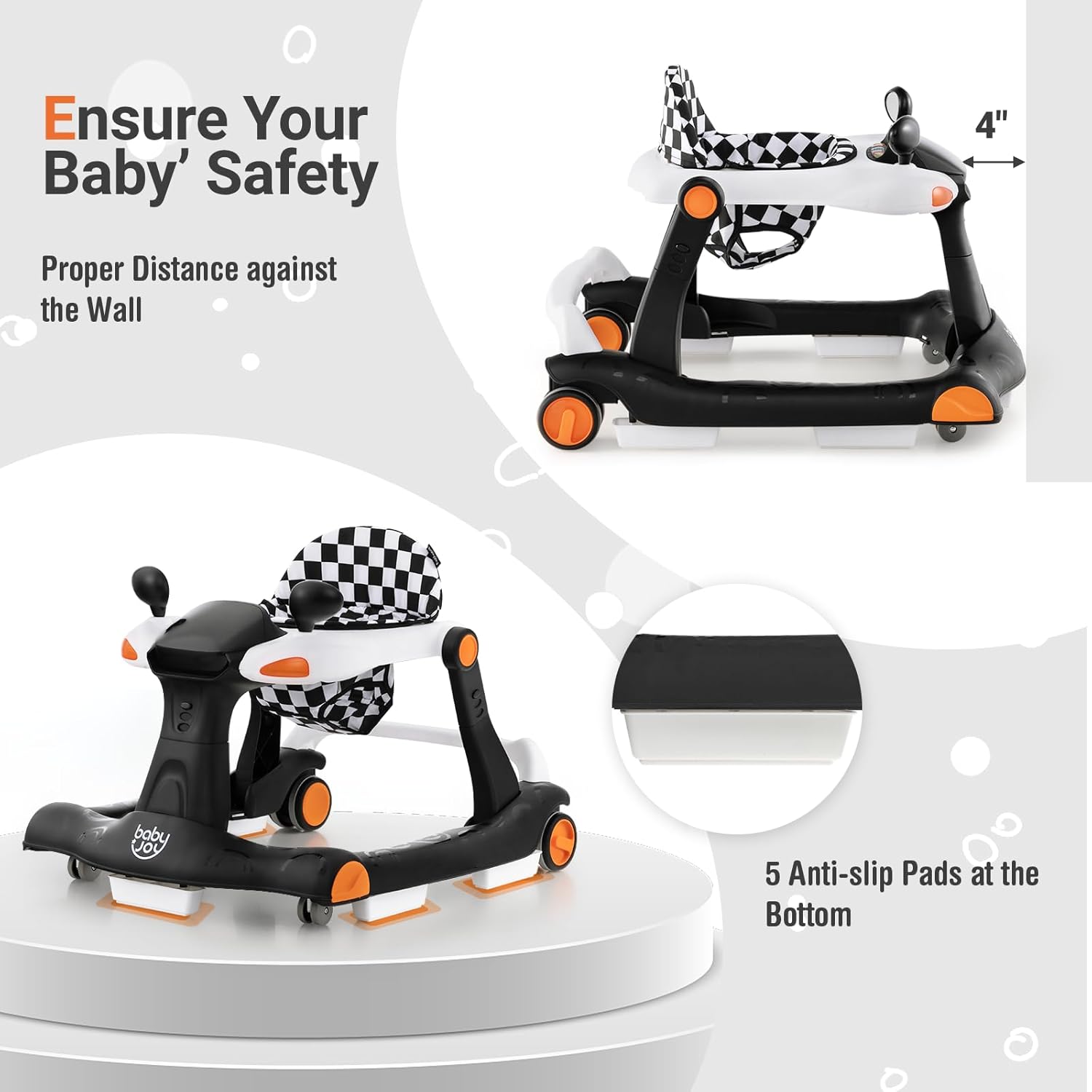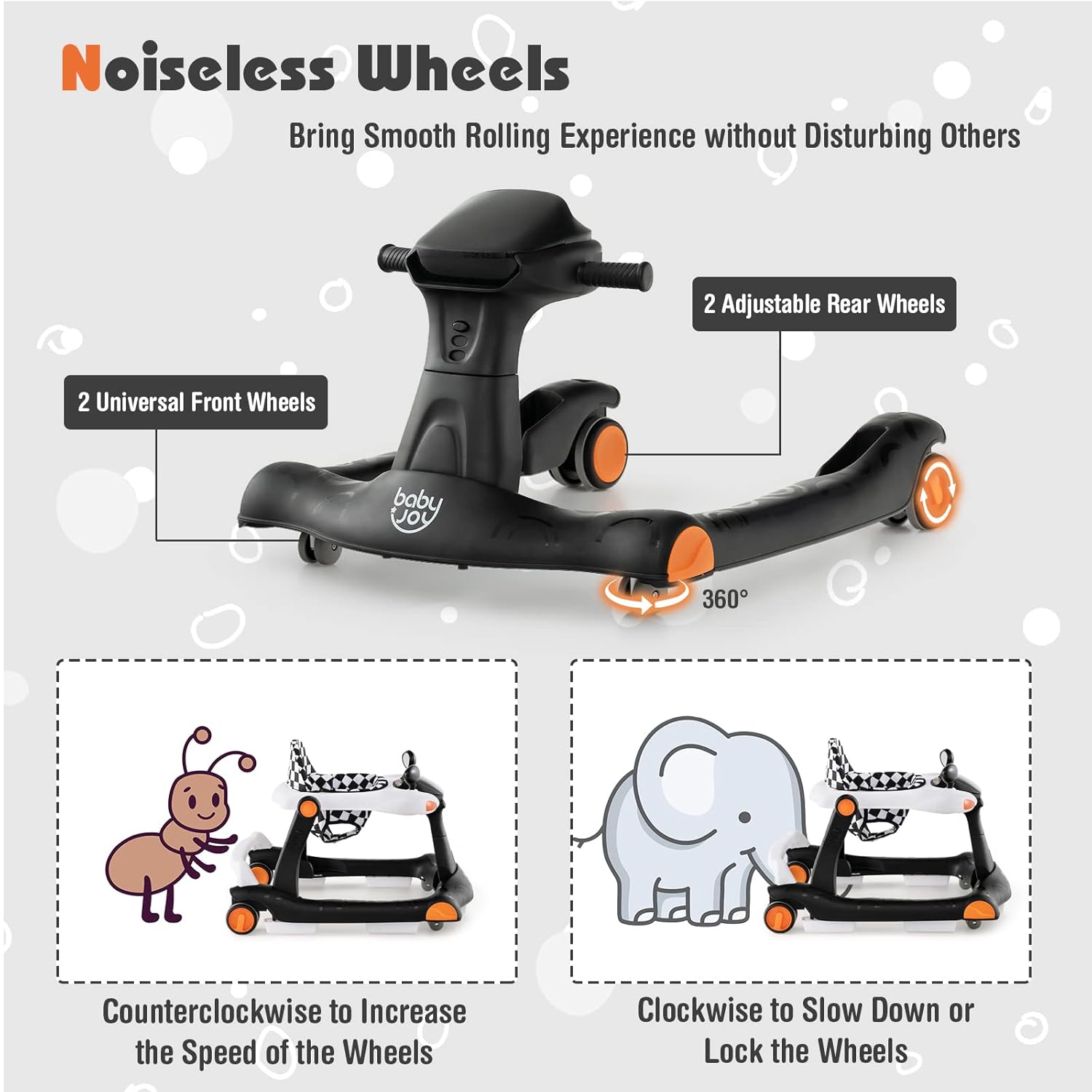 Adjustable Height & Speed: In order to grow with your little one, this multipurpose baby walker comes with 3 adjustable heights so that you are able to adjust it according to your baby’s changing height. Besides, the speed of 2 rear wheels can be adjusted based on your little one’s strength.