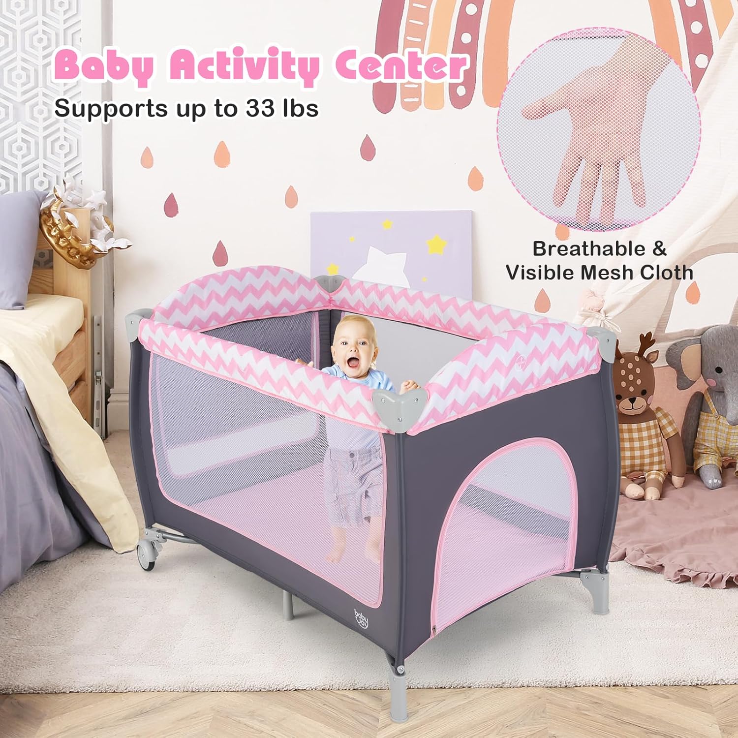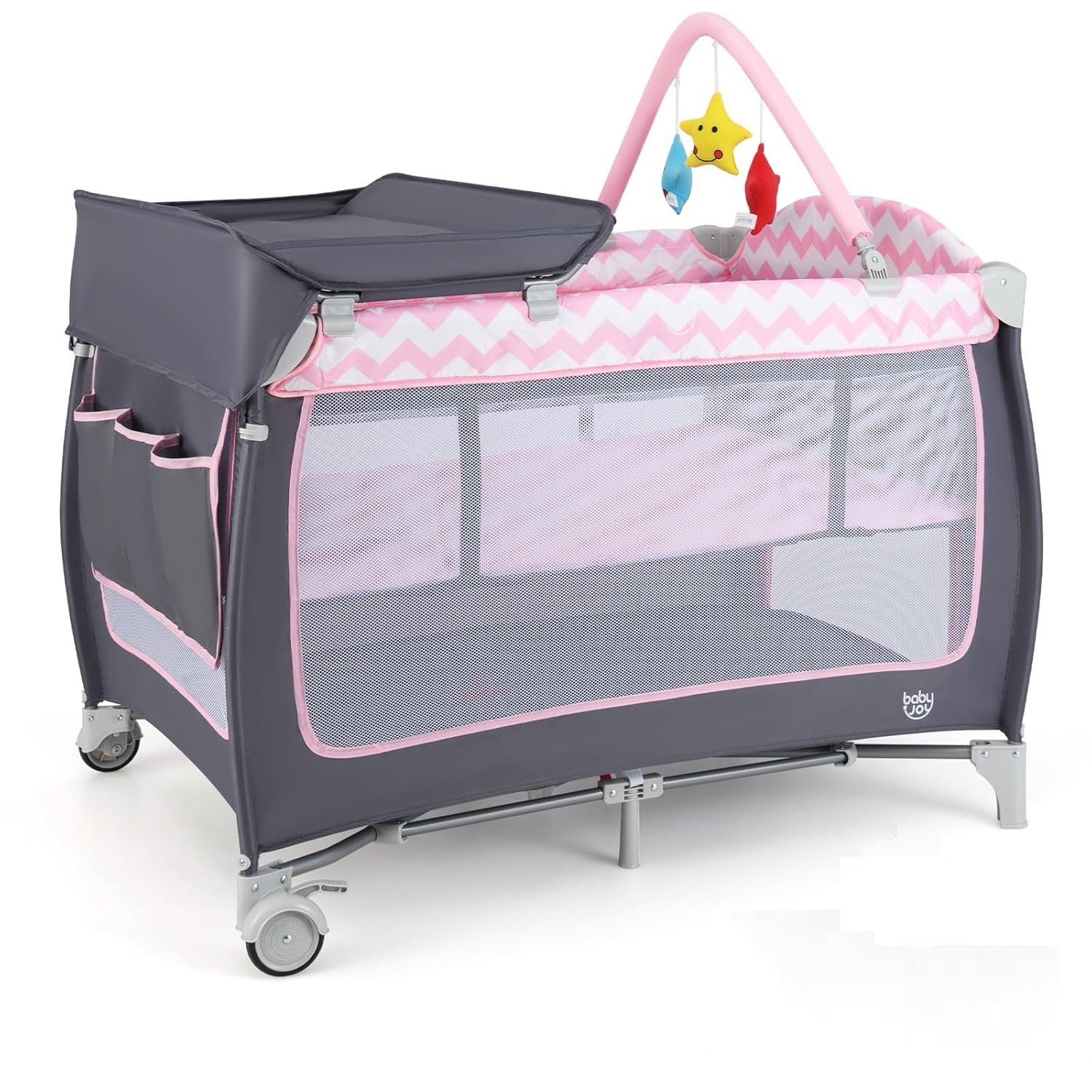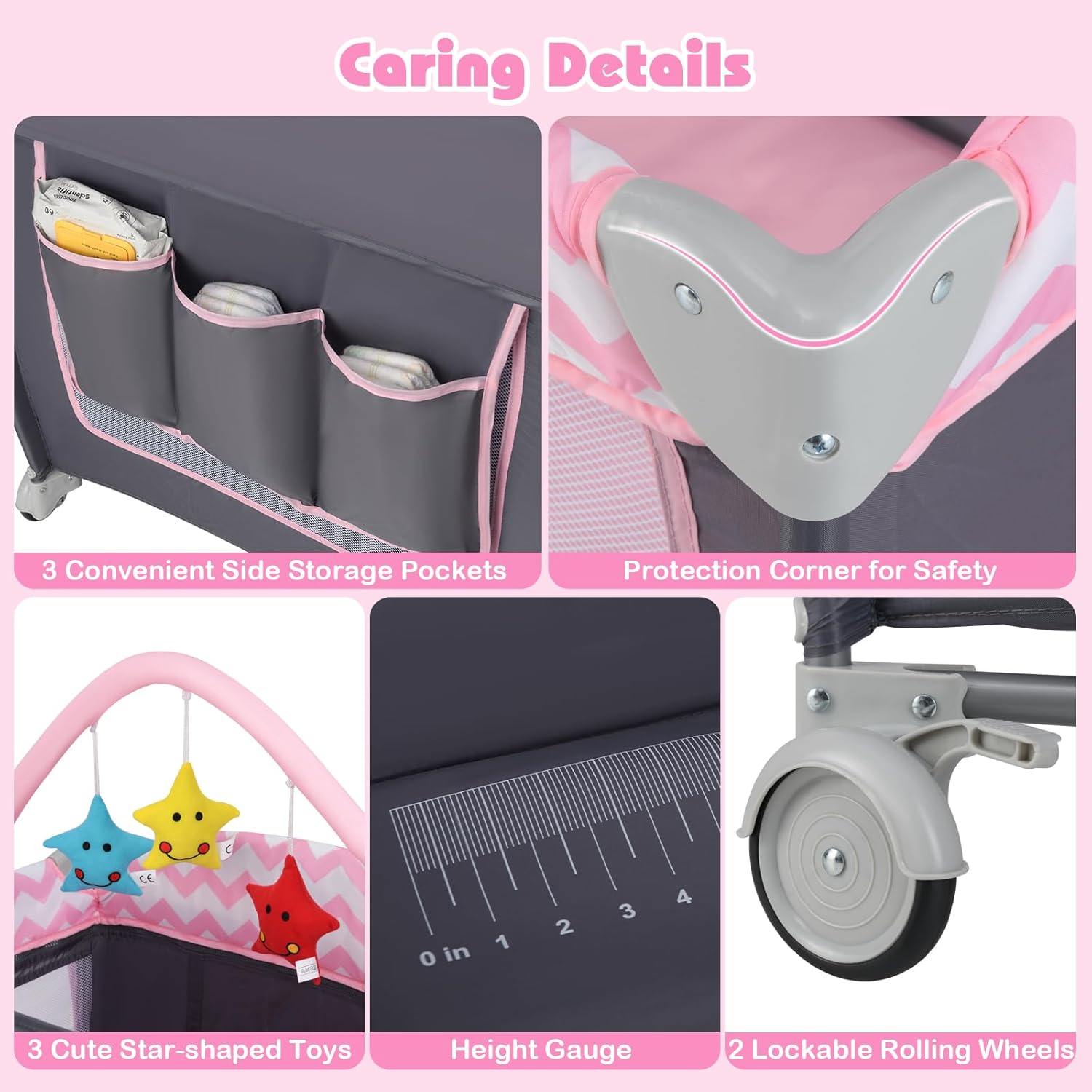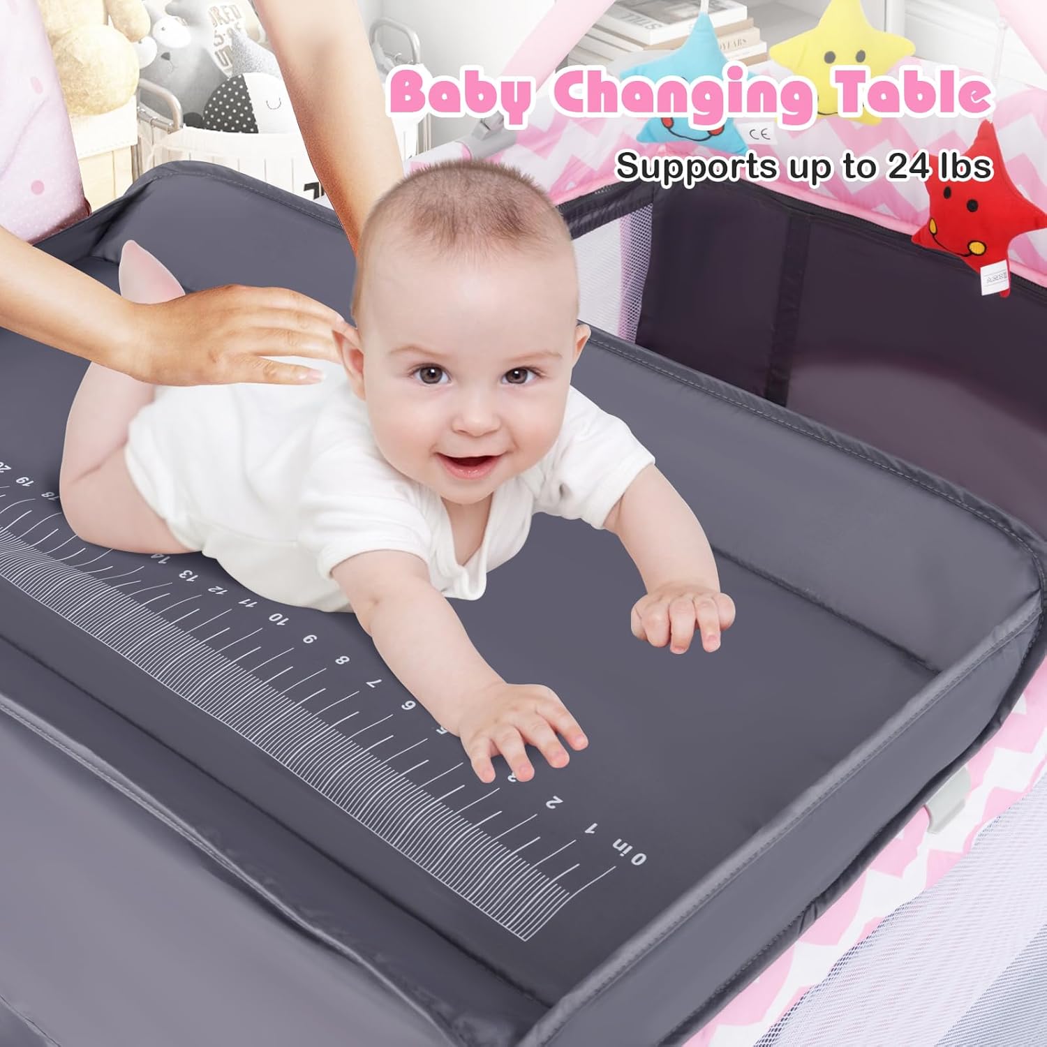 4-in-1 Multifunctional Pack and Play: Combining a bassinet bed, diaper table and activity center, our pack and play can meet various needs. The diaper table frees parents from bending over to change diapers, and the soft mattress provides a place for the baby to sleep(The size matter cover fit: 40.5 x 27.5in). Besides, the roomy playpen gives a cozy space for the baby to stand and play freely.