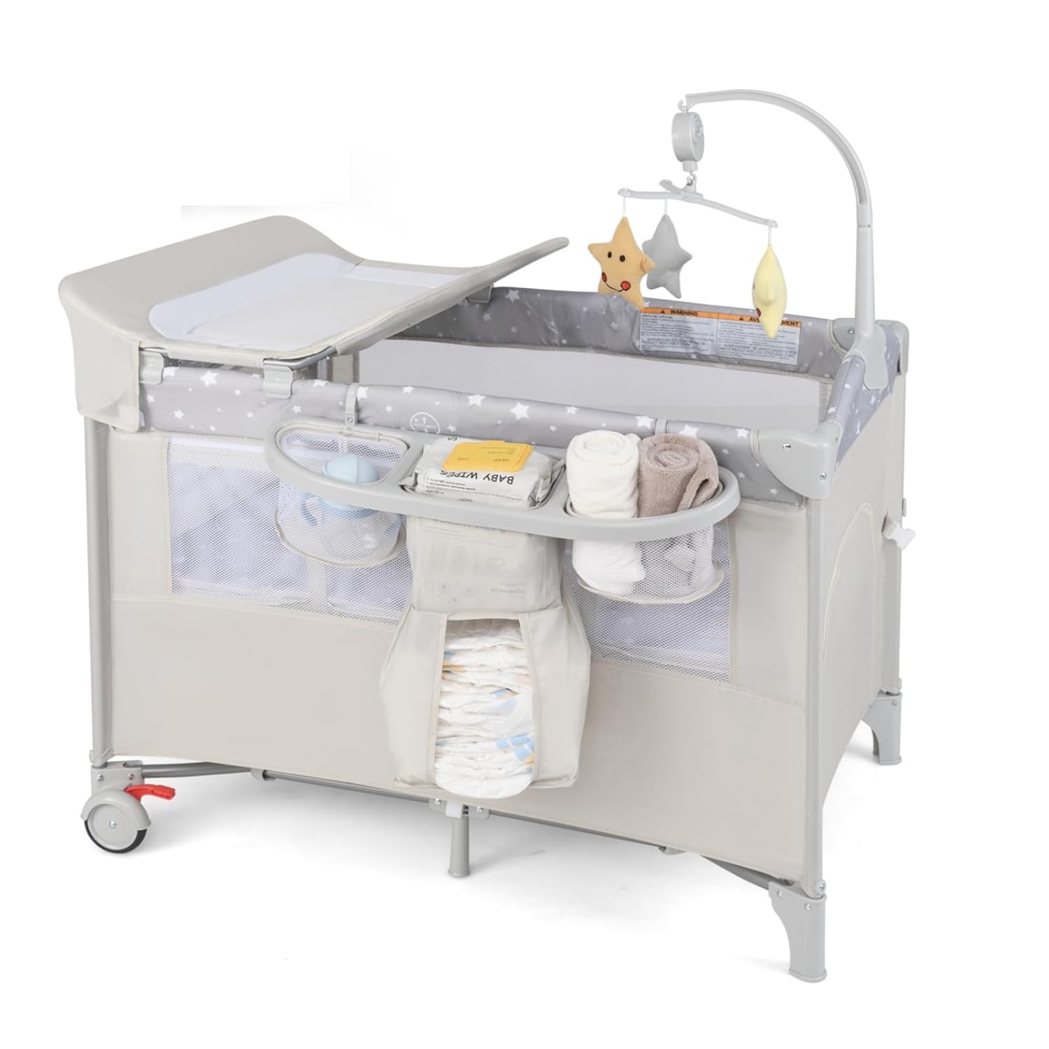 【BABY JOY 5-in-1 Pack and Play】This multifunctional baby nursery center can serve as a baby playpen, bedside crib, activity center, U-shaped diaper changing table, and baby crib. Whether it provides a comfortable resting place for your cute baby, or daily activities and care, this 5-in-1 crib is the best choice to reduce the burden on mothers. Other than that, the U-shaped diaper changing table to prevent the baby from rolling off.